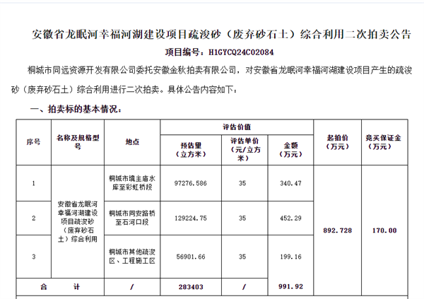 據(jù)公告顯示,此次拍賣標的為安徽省龍眠河幸福河湖建設(shè)產(chǎn)生的河道疏浚砂(廢棄砂石土),其中廢棄砂石土上岸量(處置量)約21.22萬方,淤泥等廢棄物上岸量(處置量)約7.12萬方,合計約28.34萬方。買受人僅負責(zé)拍賣標的裝運,不得自行在河道開挖。