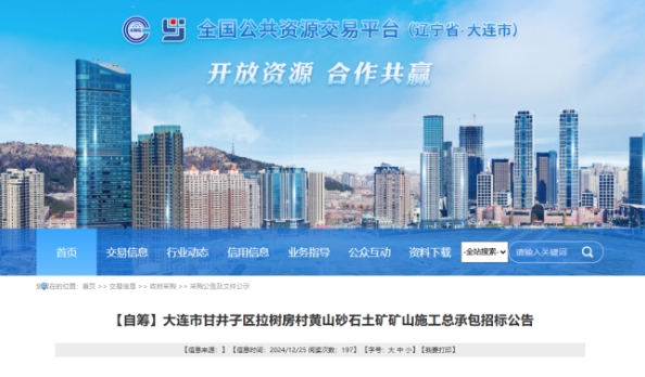 近日,遼寧省大連市公共資源交易平臺發(fā)布當?shù)馗示訁^(qū)拉樹房村黃山砂石土礦礦山施工總承包招標公告。該項目招標業(yè)主為大連空港礦業(yè)發(fā)展有限公司,本次招標開采量約3400萬立方米,年開采能力1400萬立方米,工期要求約3年。