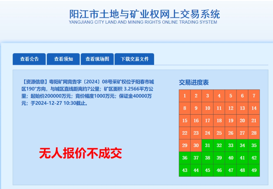 近日,廣東省陽江市陽春市輪崗礦區(qū)建筑用花崗巖礦采礦權(quán)因無人報價而流拍。 該礦權(quán)已經(jīng)是第三次流拍了 2023年11月 該項(xiàng)目首次掛牌出讓 歷經(jīng)2次延遲 最終還是流拍 2024年2月 該項(xiàng)目第二次發(fā)布出讓公告 但是在正式掛牌前一天 突然發(fā)布終止出讓公告 2024年10月22日 該項(xiàng)目發(fā)布第3次出讓公告 并降低6億的額外支付費(fèi)用 歷經(jīng)多次延遲 依舊無人報名 該項(xiàng)目建筑用花崗巖資源儲量32601.77萬立方米,半風(fēng)化花崗巖2885.2萬立方米,全風(fēng)化花崗巖4224.22萬立方米,設(shè)計(jì)生產(chǎn)規(guī)模1200萬方/年,擬出讓年限28年,掛牌起始價為20億元,還需支付額外費(fèi)用22.22億元。