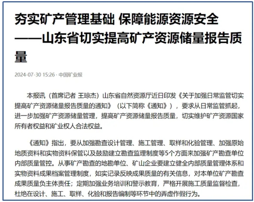《中國(guó)礦業(yè)報(bào)》報(bào)道我省切實(shí)提高礦產(chǎn)資源儲(chǔ)量報(bào)告質(zhì)量