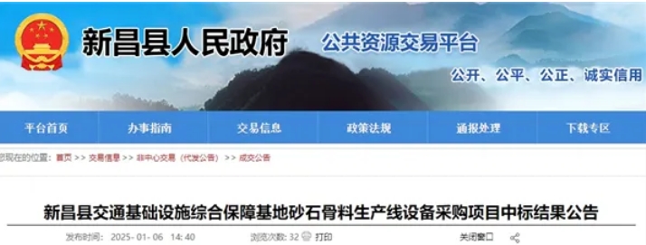 1月6日,浙江省紹興市新昌縣人民政府發(fā)布新昌縣交通基礎(chǔ)設(shè)施綜合保障基地砂石骨料生產(chǎn)線設(shè)備采購項(xiàng)目中標(biāo)公告,確定浙江雙金機(jī)械集團(tuán)股份有限公司為該項(xiàng)目的中標(biāo)人,中標(biāo)價(jià)格近1620.3萬元。