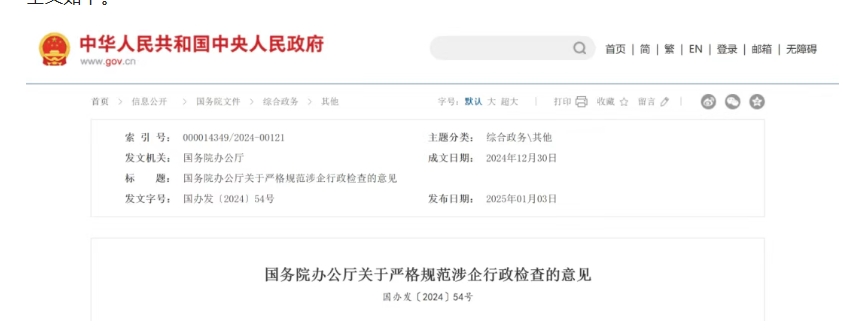 國務(wù)院辦公廳日前印發(fā)《關(guān)于嚴(yán)格規(guī)范涉企行政檢查的意見》,旨在貫徹落實(shí)黨中央關(guān)于進(jìn)一步規(guī)范涉企執(zhí)法的決策部署,嚴(yán)格規(guī)范涉企行政檢查,堅(jiān)決遏制亂檢查,切實(shí)減輕企業(yè)負(fù)擔(dān)。 意見明確,除行政執(zhí)法機(jī)關(guān)、法律法規(guī)授權(quán)組織、受委托組織外,任何組織和個(gè)人不得實(shí)施行政檢查。規(guī)范行政檢查行為,防止逐利檢查、任性檢查,涉企行政檢查要做到“五個(gè)嚴(yán)禁”“八個(gè)不得”。 嚴(yán)禁逐利檢查,不得接受被檢查企業(yè)的任何饋贈、報(bào)酬、福利待遇,不得參加被檢查企業(yè)提供的宴請、娛樂、旅游等活動,不得由被檢查企業(yè)支付消費(fèi)開支或者將檢查費(fèi)用轉(zhuǎn)嫁給企業(yè),不得強(qiáng)制企業(yè)接受指定的中介機(jī)構(gòu)提供服務(wù)。嚴(yán)禁干擾企業(yè)正常生產(chǎn)經(jīng)營,不得刻意要求法定代表人到場。嚴(yán)禁任性處罰企業(yè),不得亂查封、亂扣押、亂凍結(jié)、動輒責(zé)令停產(chǎn)停業(yè)。嚴(yán)禁下達(dá)檢查指標(biāo),不得將考核考評、預(yù)算項(xiàng)目績效與檢查頻次、罰款數(shù)額掛鉤。嚴(yán)禁變相檢查,不得以觀摩、督導(dǎo)、考察等名義行檢查之實(shí)。 全文如下。 國務(wù)院辦公廳關(guān)于嚴(yán)格規(guī)范涉企行政檢查的意見 國辦發(fā)〔2024〕54號 各省、自治區(qū)、直轄市人民政府,國務(wù)院各部委、各直屬機(jī)構(gòu):行政檢查是行政執(zhí)法主體履行行政管理職責(zé)的重要方式,對引導(dǎo)規(guī)范企業(yè)合法經(jīng)營、預(yù)防糾正違法行為具有重要作用。為貫徹落實(shí)黨中央關(guān)于進(jìn)一步規(guī)范涉企執(zhí)法的決策部署,嚴(yán)格規(guī)范涉企行政檢查,堅(jiān)決遏制亂檢查,切實(shí)減輕企業(yè)負(fù)擔(dān),經(jīng)國務(wù)院同意,現(xiàn)提出以下意見。 一、總體要求 堅(jiān)持以習(xí)近平新時(shí)代中國特色社會主義思想為指導(dǎo),深入學(xué)習(xí)貫徹習(xí)近平法治思想,全面貫徹黨的二十大和二十屆二中、三中全會精神,針對行政檢查事項(xiàng)多、頻次高、隨意性大,以及任性檢查、運(yùn)動式檢查、以各種名義變相檢查等突出問題,加強(qiáng)依法行政,確保行政檢查于法有據(jù)、嚴(yán)格規(guī)范、公正文明、精準(zhǔn)高效,進(jìn)一步優(yōu)化營商環(huán)境。 二、明確行政檢查主體,嚴(yán)禁不具備主體資格的組織實(shí)施行政檢查 實(shí)施行政檢查的主體必須具備法定資格。具有行政執(zhí)法權(quán)的行政機(jī)關(guān)必須在法定職責(zé)范圍內(nèi)實(shí)施行政檢查;法律、法規(guī)授權(quán)的具有管理公共事務(wù)職能的組織必須在法定授權(quán)范圍內(nèi)實(shí)施行政檢查;受委托組織必須在委托范圍內(nèi)實(shí)施行政檢查。除上述主體外,任何組織和個(gè)人不得實(shí)施行政檢查。行政檢查主體資格要依法確認(rèn)并向社會公告。嚴(yán)禁政府議事協(xié)調(diào)機(jī)構(gòu)以各種名義實(shí)施行政檢查;嚴(yán)禁檢驗(yàn)檢測機(jī)構(gòu)、科研院所等第三方實(shí)施行政檢查;嚴(yán)禁外包給中介機(jī)構(gòu)實(shí)施行政檢查;嚴(yán)禁未取得執(zhí)法證件的執(zhí)法輔助人員、網(wǎng)格員、臨時(shí)工等人員實(shí)施行政檢查。 三、清理并公布行政檢查事項(xiàng),從源頭上遏制亂檢查 有關(guān)主管部門要嚴(yán)格落實(shí)權(quán)責(zé)清單制度,梳理本領(lǐng)域現(xiàn)有的涉企行政檢查事項(xiàng)并實(shí)行動態(tài)管理,對沒有法定依據(jù)的要堅(jiān)決清理,對法定依據(jù)發(fā)生變化的要及時(shí)調(diào)整,對沒有實(shí)際成效的要予以取消。行政檢查事項(xiàng)要按照權(quán)責(zé)透明、用權(quán)公開的要求向社會公布,接受企業(yè)和社會監(jiān)督。行政檢查事項(xiàng)未經(jīng)公布的,不得實(shí)施。 四、合理確定行政檢查方式,最大限度減少入企檢查頻次 大力推進(jìn)精準(zhǔn)檢查,防止重復(fù)檢查、多頭檢查。能合并實(shí)施行政檢查的,不得重復(fù)檢查;能聯(lián)合實(shí)施行政檢查的,不得多頭檢查;能通過書面核查、信息共享、智慧監(jiān)管等方式監(jiān)管的,不得入企實(shí)施現(xiàn)場檢查。嚴(yán)控入企檢查人員數(shù)量,優(yōu)化“綜合查一次”、“雙隨機(jī)、一公開”抽查,推行簡單事項(xiàng)“一表通查”。除有法定依據(jù)外,不得將入企檢查作為行政許可、行政給付等行政行為的前提條件。2025年6月底前,國務(wù)院有關(guān)主管部門要建立本領(lǐng)域分級分類檢查制度;有關(guān)主管部門要公布同一行政機(jī)關(guān)對同一企業(yè)實(shí)施行政檢查的年度頻次上限。行政檢查頻次要納入行政執(zhí)法統(tǒng)計(jì)年報(bào)。根據(jù)投訴舉報(bào)、轉(zhuǎn)辦交辦、數(shù)據(jù)監(jiān)測等線索確需實(shí)施行政檢查,或者應(yīng)企業(yè)申請實(shí)施行政檢查的,可以不受頻次上限限制,但明顯超過合理頻次的,行政執(zhí)法監(jiān)督機(jī)關(guān)要及時(shí)跟蹤監(jiān)督。探索建立涉企行政執(zhí)法案件經(jīng)濟(jì)影響評估制度,依法降低行政執(zhí)法特別是行政檢查對企業(yè)的負(fù)面影響。 