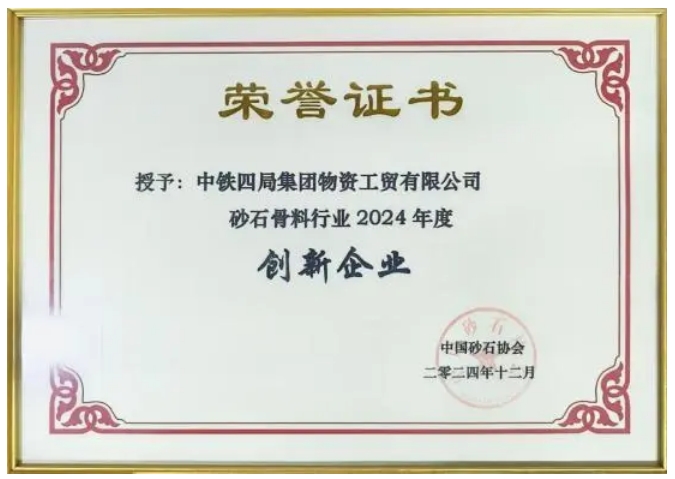 近日,中鐵四局物資公司在砂石及裝備行業(yè)取得了顯著成就,榮獲中國砂石協(xié)會頒發(fā)的2024年度“創(chuàng)新企業(yè)”榮譽證書。同時,公司副總經(jīng)理劉海林也被授予砂石骨料行業(yè)“綠色發(fā)展先鋒人物”稱號。這一榮譽不僅彰顯了物資公司在砂石領域的創(chuàng)新實力和技術(shù)領先地位,也標志著公司在推動砂石板塊高質(zhì)量發(fā)展上取得了新的突破。