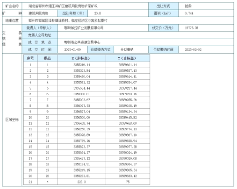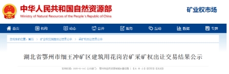 近日,湖北省鄂州市細(xì)王沖礦區(qū)建筑用花崗巖礦采礦權(quán)出讓交易結(jié)果正式公示。此次出讓受鄂州市自然資源和城鄉(xiāng)建設(shè)局委托,由鄂州市自然資源交易中心與湖北德潤(rùn)古今拍賣(mài)有限公司以拍賣(mài)方式進(jìn)行。 最終,鄂州城控礦業(yè)發(fā)展有限公司以19775.38萬(wàn)元的價(jià)格成功競(jìng)得該采礦權(quán)。其公司位于湖北省鄂州市鄂城區(qū)鳳凰街道葛山大道99號(hào),統(tǒng)一社會(huì)信用代碼為91420704MA4F49PX31。成交時(shí)間為2025年1月10日,地點(diǎn)在鄂州市公共資源交易中心,參與此次拍賣(mài)的競(jìng)買(mǎi)人僅有1人。 該礦區(qū)位于鄂州市鄂城區(qū)澤林鎮(zhèn)涂橋村、臨空經(jīng)濟(jì)區(qū)沙窩鄉(xiāng)趙寨村,面積為0.744平方千米,開(kāi)采礦種為建筑用花崗巖,開(kāi)采標(biāo)高在 223.3 米至75米之間。根據(jù)《湖北省鄂州市細(xì)王沖礦區(qū)建筑用花崗巖礦勘探報(bào)告評(píng)審意見(jiàn)書(shū)》,截至2024年9月,擬設(shè)采礦權(quán)范圍內(nèi)查明建筑用石料資源量4286.6萬(wàn)方/11188.1萬(wàn)噸,其中包括探明資源量、控制資源量和推斷資源量。擬出讓年限為20.8年,起始價(jià)為19729萬(wàn)元,出讓收益率為0%。 采礦權(quán)成交價(jià)的繳納時(shí)間為2025年2月3日,采用分期繳納的方式。公示期從2025年1月14日至2025年1月28日,若對(duì)公示內(nèi)容有異議,可在公示期內(nèi)以書(shū)面形式向鄂州市自然資源和城鄉(xiāng)建設(shè)局反映。公示無(wú)異議后,競(jìng)得人需在公示期結(jié)束后5個(gè)工作日內(nèi)與出讓人簽訂《采礦權(quán)出讓合同》,并在履行相關(guān)手續(xù)后,持成交確認(rèn)書(shū)、礦業(yè)權(quán)出讓合同、出讓收益繳納憑證等材料申請(qǐng)辦理采礦權(quán)登記手續(xù)。 此次采礦權(quán)的成功出讓?zhuān)瑢槎踔菔械慕ㄖ没◢弾r資源開(kāi)發(fā)利用提供有力保障,同時(shí)也為當(dāng)?shù)氐慕?jīng)濟(jì)發(fā)展注入新的活力,后續(xù)該項(xiàng)目的開(kāi)發(fā)建設(shè)值得持續(xù)關(guān)注。