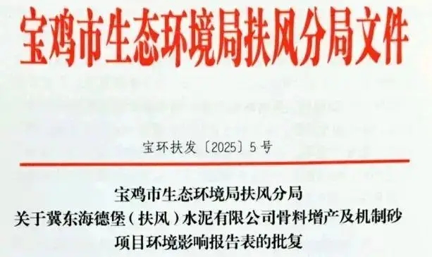 近期,陜西省寶雞市生態(tài)環(huán)境局扶風分局發(fā)布了冀東海德堡(扶風)水泥有限公司骨料增長及機制砂項目環(huán)境影響報告表的批復。