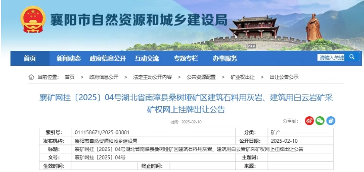 2月10日,湖北省襄陽(yáng)市自然資源和城鄉(xiāng)建設(shè)局發(fā)布南漳縣桑樹(shù)埡礦區(qū)建筑石料用灰?guī)r、建筑用白云巖礦采礦權(quán)網(wǎng)上掛牌出讓公告。 該礦保有資源量約3.17億噸,生產(chǎn)規(guī)模500萬(wàn)噸/年,掛牌起始價(jià)為2.38億元。礦山服務(wù)年限60.2年,此次出讓年限30年,含基建期1年,采礦權(quán)期限屆滿,登記的開(kāi)采區(qū)域內(nèi)仍有可供開(kāi)采的礦產(chǎn)資源的,可以依法依規(guī)申請(qǐng)續(xù)期。 據(jù)不完全統(tǒng)計(jì),2024年湖北出讓總儲(chǔ)量達(dá)45.85億噸,較2023年增加81.72%;礦山年產(chǎn)能約2.32億噸,較2023年增長(zhǎng)了約53.78%。 據(jù)悉,該礦位于南漳縣薛坪鎮(zhèn)覓水洞村、順流村,礦區(qū)面積1.2774平方公里,礦區(qū)范圍內(nèi)保有建筑用白云巖礦資源量約1.76億噸,建筑石料用灰?guī)r礦資源量約1.41億噸。 本次出讓標(biāo)的僅為采礦權(quán),不含礦區(qū)范圍內(nèi)的土地、山林等其他權(quán)利。礦區(qū)范圍內(nèi)及周邊林地、土地、安全、環(huán)保、水利、進(jìn)出道路等可能存在政策、法律等風(fēng)險(xiǎn),需由競(jìng)得人自行與相關(guān)權(quán)利人協(xié)商解決,所產(chǎn)生的一切費(fèi)用由競(jìng)得人承擔(dān)。若因無(wú)法自行協(xié)商解決不能開(kāi)采的,由競(jìng)得人承擔(dān)所有法律責(zé)任和經(jīng)濟(jì)損失。 網(wǎng)上掛牌起止時(shí)間為2025年3月11日-2025年3月25日10時(shí)。