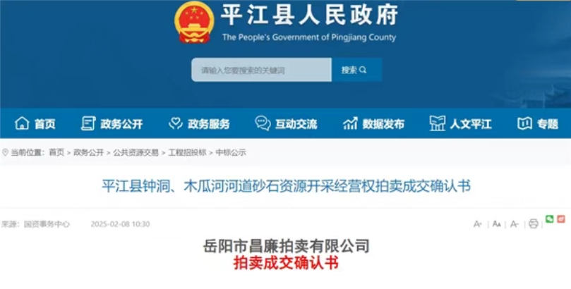 2月8日,湖南省岳陽市平江縣人民政府公布平江縣鐘洞、木瓜河河道砂石資源開采經(jīng)營權(quán)拍賣成交確認書。買受人為湖南筑川礦業(yè)有限公司,成交金額超4.76億元。據(jù)了解,湖南筑川礦業(yè)有限公司曾于2024年底以近5億元競得平江縣昌江、仙江河道砂石資源8年開采經(jīng)營權(quán)。