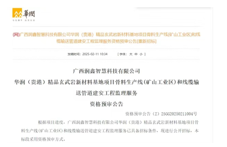 近日,廣西潤(rùn)鑫智慧科技有限公司對(duì)華潤(rùn)(貴港)精品玄武巖新材料基地項(xiàng)目骨料生產(chǎn)線(礦山工業(yè)區(qū))和線纜輸送管道建安工程監(jiān)理服務(wù)項(xiàng)目進(jìn)行招標(biāo)。該標(biāo)段采用資格預(yù)審方式,文件獲取時(shí)間2025年2月11日-17日。該項(xiàng)目位于廣西貴港市港南區(qū)木梓鎮(zhèn)、瓦塘鎮(zhèn),建設(shè)年產(chǎn)970萬(wàn)噸骨料生產(chǎn)線,監(jiān)理服務(wù)期暫定為20個(gè)月。