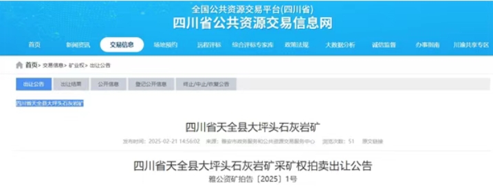 四川雅安市自然資源和規(guī)劃局發(fā)布掛牌出讓四川省天全縣大坪頭石灰?guī)r礦采礦權(quán)公告。該項(xiàng)目石灰?guī)r4611.7萬(wàn)方,另綜合開(kāi)發(fā)利用伴生玄武巖377.8萬(wàn)方,開(kāi)采規(guī)模不低于240萬(wàn)方/年,出讓年限19年,起始價(jià)1.8億元。經(jīng)計(jì)算,該項(xiàng)目資源成本至少3.6元/方。 據(jù)悉,四川省天全縣大坪頭石灰?guī)r礦礦區(qū)面積0.4635平方公里,本次出讓標(biāo)的為采礦權(quán),不包括土地使用權(quán)及其他物權(quán)。采礦權(quán)出讓收益不含相關(guān)稅費(fèi)(包含但不限于采礦權(quán)占用費(fèi)、礦山地質(zhì)環(huán)境恢復(fù)治理基金、土地及附著物補(bǔ)償、道路建設(shè)及前期出讓成本等費(fèi)用)。采礦權(quán)前期出讓成本(包括政府開(kāi)展的地勘工作費(fèi)用等)共484.66萬(wàn)元,由競(jìng)得人單獨(dú)承擔(dān)。 該項(xiàng)目拍賣時(shí)間為2025年3月25日13:30;拍賣地點(diǎn)為四川雅安市政務(wù)服務(wù)和公共資源交易服務(wù)中心。 另外,礦區(qū)范圍及爆破安全距離內(nèi)的土地、道路以及地上附著物(含果、竹、木、輸電桿線等)等生產(chǎn)生活設(shè)施的征占、使用和補(bǔ)償均由競(jìng)得人依據(jù)有關(guān)規(guī)定在當(dāng)?shù)剜l(xiāng)鎮(zhèn)人民政府的協(xié)調(diào)下自行解決,相關(guān)費(fèi)用自行承擔(dān)。存在以上問(wèn)題無(wú)法協(xié)調(diào)處理而影響礦山開(kāi)采的風(fēng)險(xiǎn),由競(jìng)得人自行承擔(dān)。