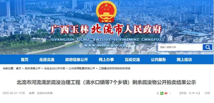 近日,廣西玉林市北流市人民政府發(fā)布北流市河流清淤疏浚治理工程(清水口鎮(zhèn)等7個(gè)鄉(xiāng)鎮(zhèn))剩余疏浚物公開(kāi)拍賣結(jié)果。