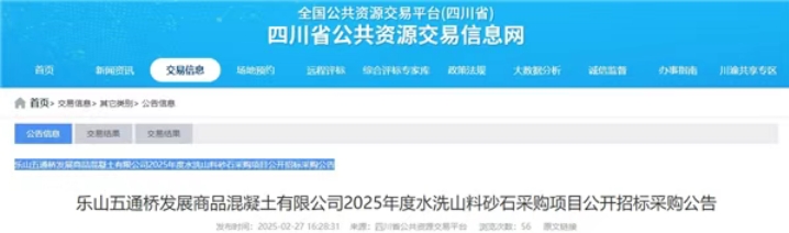近日,四川省公共資源交易中心發(fā)布樂山五通橋發(fā)展商品混凝土有限公司2025年度水洗山料砂石采購項(xiàng)目公開招標(biāo)采購公告。本次采購量共約11萬噸,其中碎石預(yù)估5萬噸,到場(chǎng)含稅價(jià)83元/噸;機(jī)制砂預(yù)估5萬噸,到場(chǎng)含稅價(jià)80元/噸;米石預(yù)估1萬噸,到場(chǎng)含稅價(jià)83元/噸。 根據(jù)采購公告,超過采購預(yù)算的報(bào)價(jià)為無效投標(biāo)。招標(biāo)文件發(fā)售起止時(shí)間為2025年2月28日至3月6日,投標(biāo)截止時(shí)間為2025年3月20日。招標(biāo)文件限價(jià)500元/包,投標(biāo)保證金5萬元/家。