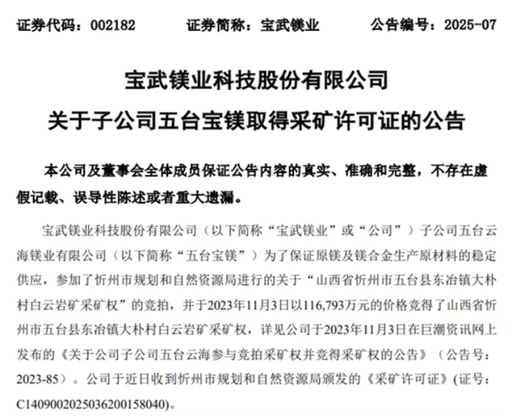 3月5日,寶武鎂業(yè)公告稱,其子公司五臺(tái)云海鎂業(yè)有限公司(簡(jiǎn)稱“五臺(tái)寶鎂”)于近日收到了山西省忻州市五臺(tái)縣東冶鎮(zhèn)大樸村白云巖礦采礦許可證,有效期限為2025年3月4日至2055年3月4日。 該礦位于五臺(tái)縣東冶鎮(zhèn)大樸村,面積2.7778平方公里。資源儲(chǔ)量約5.79億噸,其中冶鎂用白云巖超3.45億噸、耐火用白云巖超1.22億噸、建筑用白云巖超1.11億噸。生產(chǎn)規(guī)模1000萬噸/年,出讓年限30年。 據(jù)悉,為了保證原鎂及鎂合金生產(chǎn)原材料的穩(wěn)定供應(yīng),五臺(tái)寶鎂于2023年11月3日以11.68億元的價(jià)格競(jìng)得該采礦權(quán)。該許可對(duì)五臺(tái)寶鎂來說具有里程碑式的意義。不僅將有效保障原材料的穩(wěn)定供應(yīng),還將進(jìn)一步提升其市場(chǎng)競(jìng)爭(zhēng)力,為公司的長遠(yuǎn)發(fā)展注入強(qiáng)勁動(dòng)力。未來,五臺(tái)寶鎂將繼續(xù)秉持創(chuàng)新、綠色、可持續(xù)的發(fā)展理念,致力于鎂業(yè)領(lǐng)域的深耕細(xì)作,為推動(dòng)中國鎂業(yè)的高質(zhì)量發(fā)展貢獻(xiàn)更多力量。