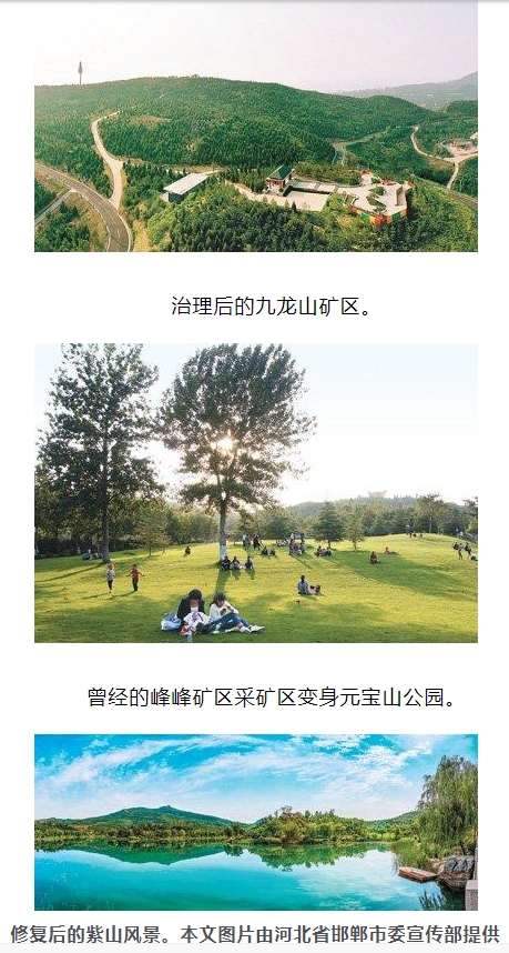 紫云湖畔,楊柳依依,湖光映青山。陳喜堂扛著綠化養(yǎng)護(hù)工具,行走在湖邊綠意盎然的山間小道上。這是他工作的地方,春光無限,山坡上栽植的桃樹,花苞已悄然開放。 陳喜堂清楚地記得,20多年前這里還是一片巨大的礦場。運(yùn)煤車來來回回,漫天煙塵。那時,灰黑色是這里的主色調(diào)。 后來,礦停了,樹越種越多,山由黑變綠。這里變身紫山公園,成為河北邯鄲的“一葉綠肺”和市民的“花園氧吧”。 河北省邯鄲市是中國重要的老鋼鐵、煤炭基地之一,近年來,當(dāng)?shù)貓远ㄗ呱鷳B(tài)優(yōu)先、綠色發(fā)展之路,持續(xù)開展礦山綜合治理和修復(fù),各類礦山礦區(qū)生態(tài)環(huán)境實(shí)現(xiàn)美麗蝶變,綠水青山正變?yōu)榻鹕姐y山。 3000多座礦減為97座 “老陳,開窗透透氣吧。”以前,每當(dāng)聽到妻子類似的話,邯鄲市叢臺區(qū)陳窯村村民陳喜堂都有些犯猶豫。讓他打退堂鼓的,不是別的,而是曾經(jīng)窗外隨時飄著的煤灰。 陳喜堂家不遠(yuǎn)處,就是太行山余脈紫山,這里距邯鄲市中心僅約15公里。因礦產(chǎn)豐富,20世紀(jì)80年代以來,紫山核心區(qū)內(nèi)先后出現(xiàn)40余家小煤礦。哐哐當(dāng)當(dāng)、轟轟隆隆的挖山采石聲,是那個年代縈繞紫山的主要“旋律”。 邯鄲市發(fā)現(xiàn)的礦產(chǎn)有32種,已投入開發(fā)利用的有19種。高峰時期,全市各類大小礦曾一度超過3000座。 采礦一時獲利,卻遺患重重:長期粗放開采,致使山林損毀、地表沉陷、生態(tài)惡化,而設(shè)施落后的煤礦企業(yè),又帶來粉塵飛揚(yáng)、車輛遺撒等二次污染。 綠色,是高質(zhì)量發(fā)展的底色。近年來,邯鄲市以生態(tài)優(yōu)先、綠色發(fā)展理念為引領(lǐng),以壯士斷腕的決心,持續(xù)打響礦山綜合治理和生態(tài)修復(fù)攻堅戰(zhàn)。 “在紫山,我們先后清除煤場、石料場200余家,40余家小煤礦全部被關(guān)停。”邯鄲市自然資源和規(guī)劃局黨組書記、局長李涌說。 邯鄲在河北省率先實(shí)施礦業(yè)權(quán)減量化管理,對經(jīng)營管理粗放、環(huán)境問題突出的采石場、小灰窯實(shí)施全面停產(chǎn)整治,出讓期滿一律關(guān)閉,依法依規(guī)堅決關(guān)停取締,同時推動礦山整合重組。 在邯鄲武安市淑村鎮(zhèn)白沙村,原有的三家礦山如今正推進(jìn)整合重組為一家,整合主體為武安市淑村鎮(zhèn)白沙村石料廠。 “整合前,單礦生產(chǎn)規(guī)模50萬噸/年,整合后,擬建生產(chǎn)規(guī)模500萬噸/年。”邯鄲市自然資源和規(guī)劃局二級調(diào)研員李建春說:“礦山整合優(yōu)化了礦山布局,促進(jìn)了礦山之間夾縫及周邊資源利用,解決了以往露天礦山開采生態(tài)修復(fù)邊坡殘山多、工程治理難等多個問題。” 邯鄲市固體礦山數(shù)量由3000多座減為2015年底的373座,并進(jìn)一步減少至目前的97座,礦山小、散、亂、污等問題得到有效解決。 廢棄礦山上植樹,難度大、挑戰(zhàn)多 礦山關(guān)停后,紫山恢復(fù)了往日的寧靜,但留下遍地的礦渣待清理。紫山修復(fù)的更大挑戰(zhàn)在于缺水,而植樹正需要水源。 紫山區(qū)域雖自古碧水環(huán)繞,但隨著時間推移和自然、經(jīng)濟(jì)因素影響,水資源變得嚴(yán)重匱乏,已影響到百姓日常耕種和林地灌溉。 沒水咋辦? 外引水源,叢臺區(qū)積極推進(jìn)西部生態(tài)引水工程,工程全長16.4公里,實(shí)現(xiàn)日引水3萬立方米。 源自滏陽河的“源頭活水”,被引入了整個紫山區(qū)域,不僅滿足植物生長所需,還能潤澤附近10余萬居民,并有效遏制了邯鄲西部地下水位下降趨勢。 “紫山修復(fù)時我們引入成活率高、觀賞性強(qiáng)的櫸樹、國槐、欒樹、水杉等樹種,聘請專家級生態(tài)園林公司對樹木進(jìn)行移植、管護(hù),并在下層配以灌、草、藤的復(fù)層結(jié)構(gòu),開展微景觀設(shè)計,保證了樹木的成活率。”叢臺區(qū)紫山服務(wù)中心主任岳飛飛說。 紫山區(qū)域近年來先后植樹逾80萬棵,增綠6500多畝,森林覆蓋率從16%提升到96%。 比起缺水,更棘手的問題是“起火”。 武安市的九龍山,因地下煤炭資源豐富,曾布滿煤礦、煤場和“散亂污”企業(yè)。自20世紀(jì)八九十年代起,歷經(jīng)20多年過度開采,不僅巖石裸露、渣石遍地,還累積形成了一座占地65畝、高約70米的煤矸石渣山堆。 “煤矸石山存在安全隱患,時有滑坡現(xiàn)象,其堆心內(nèi)常年自燃,內(nèi)部溫度最高可達(dá)300攝氏度。”武安市自然資源和規(guī)劃局局長王旭東說。 如此溫度,如何種樹? 在煤矸石山的生態(tài)治理中,武安市近幾年通過對山體坡度進(jìn)行消減,外運(yùn)渣土100多萬方,并對發(fā)生自燃的矸石進(jìn)行泥漿封殼和覆土隔絕,采用黃土分層碾壓,覆土2米以上,使自燃煤矸石內(nèi)部空氣逐漸耗盡。 “土層之上,以生態(tài)綠色、季相變化為原則,種植油松、雪松、月季等多品種、多層次的喬灌組合,營造出山林蔥郁的綠色空間。”王旭東說。 如今到訪煤矸石山,這里已是綠意蔥蘢,廢山變“寶山”。 從九龍山驅(qū)車南行約16公里,便是原金葫蘆露天石料采礦區(qū)。經(jīng)多年開采,這里形成了白茬山、渣堆、采礦平臺等采礦痕跡,地形地貌景觀受到嚴(yán)重破壞。 這樣的石頭山上,怎么種樹呢? “我們先清除危巖,然后平整場地,修起一排排擋墻,在擋墻與