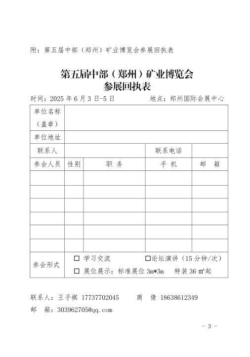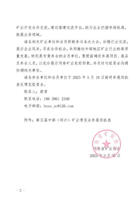各相關(guān)礦業(yè)單位和會員單位: 為貫徹落實國家區(qū)域協(xié)調(diào)發(fā)展戰(zhàn)略和礦產(chǎn)資源安全戰(zhàn)略,加強(qiáng)中部地區(qū)礦業(yè)行業(yè)交流與合作,推動礦業(yè)科技創(chuàng)新和產(chǎn)業(yè)升級,由我會主辦的第五屆中部(鄭州)礦業(yè)博覽會將于2025年6月3-5日在鄭州國際會展中心舉行。 本次博覽會以“綠色創(chuàng)新·智啟未來”為主題,聚焦智能開采裝備、綠色礦山技術(shù)、新興產(chǎn)業(yè)礦產(chǎn)開發(fā)和國際礦業(yè)合作四大核心領(lǐng)域,鏈接“裝備制造走廊”與礦業(yè)需求,設(shè)立“中非礦業(yè)合作專區(qū)”,緊盯“一帶一路”新機(jī)遇,力促礦業(yè)領(lǐng)域項目合作,努力打造中部地區(qū)最具影響力的行業(yè)盛會。 屆時大會將匯聚國內(nèi)外礦業(yè)領(lǐng)域的領(lǐng)導(dǎo)、專家學(xué)者和企業(yè)代表,舉辦多場高端論壇、技術(shù)交流會和項目對接會,共同探討行業(yè)發(fā)展趨勢,展示礦業(yè)領(lǐng)域的新技術(shù)、新裝備、新成果,促進(jìn)國內(nèi)外礦業(yè)開發(fā)合作交流。通過搭建交流平臺,助力企業(yè)把握市場機(jī)遇,拓展業(yè)務(wù)領(lǐng)域。 請各相關(guān)礦業(yè)單位和會員積極參與本次大會,加強(qiáng)行業(yè)交流,展示企業(yè)風(fēng)采,尋求合作機(jī)會,共同推動中部地區(qū)礦業(yè)行業(yè)的高質(zhì)量發(fā)展。特別是有意參會的會員單位,要提前確定參展項目、展品及參會人員,以充分展示河南礦業(yè)良好形象,并及時與組委會溝通協(xié)調(diào)相關(guān)事宜。 請各參會單位和會員單位于2025年5月10日前將參展回執(zhí)表反饋至組委會。 聯(lián)系人:商倩 聯(lián)系電話:18638612349 電子郵箱:hnss_sc@126.com 附件:第五屆中部(鄭州)礦業(yè)博覽會參展回執(zhí)表 河南省礦業(yè)協(xié)會 2025年3月20日