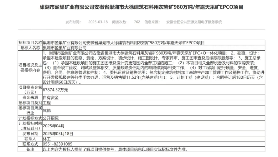 日前,安徽合肥公共資源交易中心發(fā)布巢湖市大徐建筑石料用灰?guī)r礦980萬噸/年露天采礦EPCO項(xiàng)目招標(biāo)計(jì)劃。該項(xiàng)目總投資近6.8億元,計(jì)劃2025年4月招標(biāo)。 據(jù)悉,該礦權(quán)位于巢湖市蘇灣鎮(zhèn)境內(nèi),是安徽省首個(gè)線上掛牌交易的采礦權(quán)項(xiàng)目,由安徽當(dāng)?shù)貒?guó)企巢湖市盈巢礦業(yè)有限公司以15億競(jìng)得,溢價(jià)10億,溢價(jià)率200%。礦區(qū)內(nèi)建筑石料用灰?guī)r礦資源量為4275.89 萬立方米(合11373.85萬噸),擬設(shè)礦山生產(chǎn)規(guī)模980萬噸/年,出讓年限12年。 項(xiàng)目概況及主要招標(biāo)內(nèi)容如下: 1、巢湖市盈巢礦業(yè)有限公司安徽省巢湖市大徐建筑石料用灰?guī)r礦980萬噸/年露天采礦EPC+O一體化項(xiàng)目; 2、勘察、設(shè)計(jì):承擔(dān)本建設(shè)項(xiàng)目的勘察、測(cè)繪、方案設(shè)計(jì)、初步設(shè)計(jì)、施工圖設(shè)計(jì)、專家評(píng)審、施工圖審查及后續(xù)跟蹤服務(wù)等; 3、施工總承包:(1)承擔(dān)本建設(shè)項(xiàng)目的施工圖圖紙及設(shè)計(jì)變更范圍內(nèi)全部工程的施工;(2)本項(xiàng)目相關(guān)全部設(shè)備及材料的采購(gòu)安裝;(3)直至竣工驗(yàn)收、調(diào)試及整體移交、質(zhì)量缺陷責(zé)任期內(nèi)的缺陷修復(fù)等相關(guān)工作;(4)對(duì)工程項(xiàng)目進(jìn)行質(zhì)量、安全、進(jìn)度、費(fèi)用、合同、信息等管理和控制; 4、委托運(yùn)營(yíng)及銷售范圍:包含制定建筑材料加工基地生產(chǎn)加工管理工作及銷售工作,協(xié)助進(jìn)行開發(fā)報(bào)規(guī)報(bào)建等各類手續(xù)辦理,運(yùn)營(yíng)及銷售期11.53年(含基建期1年); 5、計(jì)劃工期(建設(shè)期):合同簽訂后180日歷天(含設(shè)計(jì)周期60日歷天)。