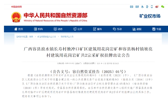 近日,廣西容縣浪水鎮(zhèn)長(zhǎng)壽村獨(dú)沖口礦區(qū)建筑用花崗巖礦和容縣楊村鎮(zhèn)坡亮村建筑用花崗巖礦共2宗采礦權(quán)掛牌出讓。 廣西容縣浪水鎮(zhèn)長(zhǎng)壽村獨(dú)沖口礦區(qū)建筑用花崗巖礦位于容縣浪水鎮(zhèn)長(zhǎng)壽村一帶,開采礦種建筑用花崗巖,保有查明建筑用砂1097.59萬(wàn)噸、機(jī)制砂6831.63萬(wàn)噸、建筑用花崗巖礦3591.12萬(wàn)噸,資源儲(chǔ)量合計(jì)11520萬(wàn)噸,掛牌起始價(jià)18600萬(wàn)元; 容縣楊村鎮(zhèn)坡亮村建筑用花崗巖礦容縣楊村鎮(zhèn)坡亮村一帶,開采礦種:建筑用花崗巖,保有查明建筑用砂296.66萬(wàn)噸、機(jī)制砂797.73萬(wàn)噸、建筑用花崗巖礦9429.09萬(wàn)噸,資源儲(chǔ)量合計(jì)10523萬(wàn)噸,掛牌起始價(jià)9600萬(wàn)元。 兩宗礦權(quán)總儲(chǔ)量超2.2億噸,起始價(jià)共計(jì)2.82億元,噸成本約1.28元/噸。 01、廣西容縣浪水鎮(zhèn)長(zhǎng)壽村獨(dú)沖口礦區(qū)建筑用花崗巖礦 開采礦種:建筑用花崗巖 地理位置:容縣浪水鎮(zhèn)長(zhǎng)壽村一帶 資源儲(chǔ)量:保有查明建筑用砂(全風(fēng)化層)資源量為657.24萬(wàn)立方米(1097.59萬(wàn)噸),機(jī)制砂(中風(fēng)化層及破碎新鮮花崗巖層)資源量為2627.55萬(wàn)立方米(6831.63萬(wàn)噸),建筑用花崗巖礦(新鮮基巖)資源量為1344.99萬(wàn)立方米(3591.12萬(wàn)噸)。可利用建筑用砂(全風(fēng)化層)資源量為640.73萬(wàn)立方米(合1070.02萬(wàn)噸),可利用機(jī)制砂(中風(fēng)化層及破碎新鮮花崗巖層)資源量為1875.69萬(wàn)立方米(4876.79萬(wàn)噸),可利用建筑用花崗巖礦(新鮮基巖)資源量為997.95萬(wàn)立方米(2664.53萬(wàn)噸)。 開采標(biāo)高: 299.38米至 100米 資源開發(fā)利用情況:采礦權(quán)新立,無(wú)開采活動(dòng)。 礦山地質(zhì)環(huán)境保護(hù)及土地復(fù)墾要求:為了保護(hù)生態(tài)環(huán)境,創(chuàng)建綠色礦山,競(jìng)得人需承擔(dān)礦區(qū)礦山地質(zhì)環(huán)境恢復(fù)治理和土地復(fù)墾主體責(zé)任。礦山開采,生產(chǎn)加工區(qū)必須按照環(huán)保要求進(jìn)行布置,且各加工區(qū)工序及廢棄物排放需達(dá)到國(guó)家的相關(guān)標(biāo)準(zhǔn)。 擬出讓年限:20年(含基建期約1.2年) 起始價(jià):18600萬(wàn)元 出讓方式:掛牌 掛牌時(shí)間:2025年04月29日—2025年05月16日 2025年4月29日9時(shí)至2025年5月16日10時(shí)。 網(wǎng)上地址: http://ggzy.jgswj.gxzf.gov.cn/gxggzy/tydl/login.html 02、容縣楊村鎮(zhèn)坡亮村建筑用花崗巖礦 開采礦種:建筑用花崗巖 地理位置:容縣楊村鎮(zhèn)坡亮村一帶 資源儲(chǔ)量:保有查明建筑用砂(全風(fēng)化層)資源量為186.58萬(wàn)立方米(合296.66萬(wàn)噸),機(jī)制砂(中風(fēng)化層及破碎新鮮花崗巖層)資源量為320.37萬(wàn)立方米(合797.73萬(wàn)噸),建筑用花崗巖礦(新鮮基巖)資源量為3786.78萬(wàn)立方米(合9429.09萬(wàn)噸)。可利用建筑用砂(全風(fēng)化層)資源量為171.53萬(wàn)立方米(合272.73萬(wàn)噸),可利用機(jī)制砂(中風(fēng)化層及破碎新鮮花崗巖層)資源量為272.92萬(wàn)立方米(合679.57萬(wàn)噸),可利用建筑用花崗巖礦(新鮮基巖)資源量為1384.73萬(wàn)立方米(合3447.98萬(wàn)噸)。 開采標(biāo)高: 583米至 280米 資源開發(fā)利用情況:采礦權(quán)新立,無(wú)開采活動(dòng)。 礦山地質(zhì)環(huán)境保護(hù)及土地復(fù)墾要求:為了保護(hù)生態(tài)環(huán)境,創(chuàng)建綠色礦山,競(jìng)得人需承擔(dān)礦區(qū)礦山地質(zhì)環(huán)境恢復(fù)治理和土地復(fù)墾主體責(zé)任。礦山開采,生產(chǎn)加工區(qū)必須按照環(huán)保要求進(jìn)行布置,且各加工區(qū)工序及廢棄物排放需達(dá)到國(guó)家的相關(guān)標(biāo)準(zhǔn)。 擬出讓年限:20年(含基建期約2年) 起始價(jià):9600萬(wàn)元 出讓方式:掛牌 掛牌時(shí)間:2025年04月29日—2025年05月16日 2025年4月29日9時(shí)至2025年5月16日10時(shí) 網(wǎng)上地址:http://ggzy.jgswj.gxzf.gov.cn/gxggzy/tydl/login.html 據(jù)公告顯示,擬出讓兩個(gè)采礦權(quán)僅可對(duì)建筑用花崗巖礦、建筑用砂礦、中風(fēng)化花崗巖礦等進(jìn)行開發(fā)利用,競(jìng)得人應(yīng)嚴(yán)格按照批準(zhǔn)的礦種及編制的開發(fā)利用方案開采。競(jìng)得人在開采過(guò)程中如發(fā)現(xiàn)有未批準(zhǔn)或出讓的其它礦種,應(yīng)停止開采作業(yè),及時(shí)采取保護(hù)和安全管護(hù)等措施,并報(bào)告容縣自然資源局,待有權(quán)限的自然資源部門處理完畢后方可繼續(xù)生產(chǎn)。若故意隱瞞不報(bào)、擅自銷售或造成國(guó)家礦產(chǎn)資源破壞、流失的,競(jìng)得人應(yīng)承擔(dān)相應(yīng)的法律責(zé)任。