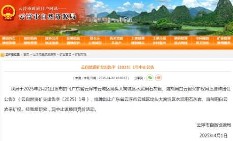 4月1日,云浮市自然資源局發(fā)布公告,《廣東省云浮市云城區(qū)坳頭大窩坑區(qū)水泥用石灰?guī)r、溶劑用白云巖采礦權(quán)網(wǎng)上掛牌出讓公告》(云自然資礦交出告字〔2025〕1號(hào)),掛牌出讓廣東省云浮市云城區(qū)坳頭大窩坑區(qū)水泥用石灰?guī)r、溶劑用白云巖采礦權(quán),經(jīng)研究,現(xiàn)中止該項(xiàng)目競(jìng)價(jià)活動(dòng)。 據(jù)了解,該項(xiàng)目礦區(qū)位于云浮市云城區(qū)城區(qū)南部18公里,開(kāi)采礦種為水泥用石灰?guī)r、熔劑用白云巖,生產(chǎn)規(guī)模1100萬(wàn)噸/年,掛牌起始價(jià)6.5億元,出讓年限30年。 該項(xiàng)目確定的水泥用石灰?guī)r、熔劑用白云巖和水泥用配料類(lèi)礦石可采儲(chǔ)量為28484.79萬(wàn)噸,其中水泥用石灰?guī)r礦17411.32萬(wàn)噸,熔劑用白云巖礦8428.90萬(wàn)噸,水泥配料類(lèi)原料礦石量1461.09萬(wàn)立方米(2644.57萬(wàn)噸)。 另外,競(jìng)得人須承擔(dān)礦區(qū)范圍內(nèi)的土地租金、青苗補(bǔ)償、遷墳費(fèi)等費(fèi)用2.73億元;競(jìng)得人從2025年起須每年支付鄉(xiāng)村振興建設(shè)資金合計(jì)200萬(wàn)元。 掛牌公告時(shí)間:2025年2月21日00:00 至 2025年3月20日23:59止 掛牌報(bào)價(jià)時(shí)間:2025年3月21日8:00 至 2025年4月7日10:00止 采礦權(quán)競(jìng)得人在領(lǐng)取《采礦許可證》之日起24個(gè)月內(nèi)完成基礎(chǔ)設(shè)施建設(shè)并投產(chǎn),36個(gè)月內(nèi)達(dá)到年產(chǎn)1100萬(wàn)噸的產(chǎn)量。 出讓礦區(qū)紅線范圍壓占鄉(xiāng)道Y720線,競(jìng)得人需按比例承擔(dān)省道S265工程的建設(shè)費(fèi)用,具體事宜由云城區(qū)人民政府與競(jìng)得人另簽協(xié)議解決。