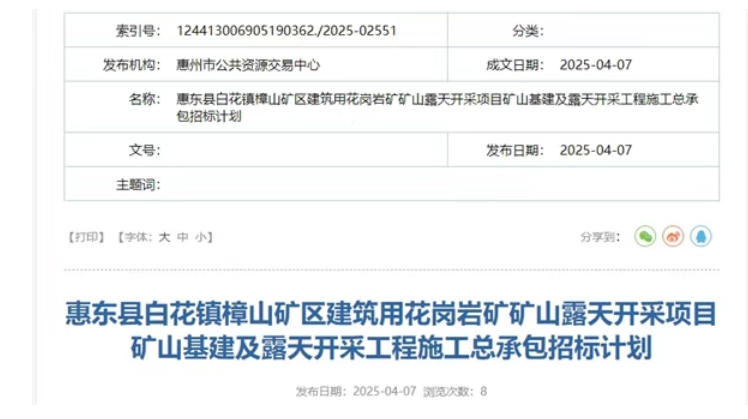 4月7日,廣東省惠州市公共資源交易中心發(fā)布惠東縣白花鎮(zhèn)樟山礦區(qū)建筑用花崗巖礦礦山露天開采項目礦山基建及露天開采工程施工總承包招標(biāo)計劃。該項目招標(biāo)人為惠州交投礦業(yè)全資子公司惠州市匯恒源實業(yè)有限公司,預(yù)計發(fā)包價8029.66萬元,預(yù)計招標(biāo)時間為2025年5月。 根據(jù)公告,該項目位于惠東縣白花鎮(zhèn),有簡易公路1.0公里與G228公路相連,沿G228約6.5公里可達(dá)惠東縣城。礦區(qū)可采儲量為資源量165.19萬方,設(shè)計年開采規(guī)模50萬方,出讓年限5年。 據(jù)砂石骨料網(wǎng)了解,2024年4月12日,惠州市匯恒源實業(yè)有限公司以1397.51萬元價格成功競得該礦權(quán)。這是惠州交投繼摘得惠東梁化、博羅神山、仲愷陽光、龍門葛埔、惠陽新圩、惠城橫瀝及惠東平海采礦權(quán)后,成功競得的第8宗采礦權(quán)。其中,博羅神山石場、惠陽新圩石場、惠城橫瀝石場、惠東梁化石場和龍門葛埔石場均已全面投產(chǎn)。