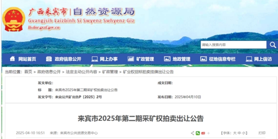 4月10日,廣西來(lái)賓市自然資源局發(fā)布2025年第二期采礦權(quán)拍賣出讓公告。本次出讓的采礦權(quán)為武宣縣祿新鎮(zhèn)獅子山礦區(qū)白云巖礦,屬凈采礦權(quán)出讓,累計(jì)查明資源儲(chǔ)量(石灰?guī)r+白云巖)約1.12億噸,可采儲(chǔ)量約1.05億噸,生產(chǎn)規(guī)模370萬(wàn)噸/年,出讓年限30年,起始價(jià)超2.23億元,其他費(fèi)用約2268.53萬(wàn)元,資源成本超2.19元/噸。 本次采礦權(quán)拍賣出讓涉及的采礦權(quán)出讓收益繳納方式為分期繳納,共分16期,首期征收比例為成交采礦權(quán)出讓收益的15%;剩余部分在采礦許可證有效期內(nèi)按約定分期繳清,均攤征收年限為15年,每年度一期,每期具體繳款時(shí)間及金額在采礦權(quán)出讓合同中確定。競(jìng)得人也可一次性繳清采礦權(quán)出讓收益。 該采礦權(quán)位于武宣縣城西南220°方向的獅子山一帶,與武宣縣城直線距離約15千米,屬武宣縣祿新鎮(zhèn)管轄。礦區(qū)北面有武平高速、S323省道、東有G209國(guó)道可達(dá)武宣縣城。礦區(qū)東面有簡(jiǎn)易公路與村、鄉(xiāng)鎮(zhèn)道路相通,西面有礦山公路與鄉(xiāng)鎮(zhèn)道路相連,武宣縣建有龍從新碼頭,黔江可通航上至柳州,下至桂平、梧州、廣州。武宣縣跟貴港市都建有可通航水運(yùn)的碼頭,礦區(qū)公路到武宣縣龍從新碼頭約21千米,到貴港市大東碼頭約60千米,交通便利。 擬出讓礦區(qū)范圍及影響范圍合計(jì)1323.15畝土地及地面附著物的權(quán)屬已初步認(rèn)定,土(林)地征(租)用、地面附著物等補(bǔ)償費(fèi)已由武宣縣征地辦進(jìn)行核算,涉及所需土地征用、墳?zāi)拱徇w費(fèi)用總共約1640.73萬(wàn)元。 此外,該采礦權(quán)為原礦山擴(kuò)大礦區(qū)范圍重新出讓的情形,原有礦山資產(chǎn)為原采礦權(quán)剩余已出讓未采出白云巖資源量為64.82萬(wàn)噸,經(jīng)委托資質(zhì)單位評(píng)估,原采礦權(quán)價(jià)值平均估值為246.9萬(wàn)元。競(jìng)得人在15日內(nèi)按資產(chǎn)評(píng)估值一次性全額支付補(bǔ)償款到武宣縣人民政府指定賬戶。 同時(shí),該礦山已完成的出讓前期工作包括礦產(chǎn)資源開(kāi)發(fā)利用與保護(hù)總體方案、水土保持方案、環(huán)境影響報(bào)告、林地使用可行性報(bào)告及安全設(shè)計(jì)三同時(shí)報(bào)告編制、采礦權(quán)出讓收益和資產(chǎn)評(píng)估,費(fèi)用總計(jì)380.9萬(wàn)元。 其中,礦產(chǎn)資源開(kāi)發(fā)利用與保護(hù)總體方案編制費(fèi)用為273萬(wàn)元,水土保持方案、環(huán)境影響報(bào)告、林地使用可行性報(bào)告及安全設(shè)計(jì)三同時(shí)報(bào)告編制費(fèi)用為99.2萬(wàn)元,采礦權(quán)出讓收益評(píng)估經(jīng)費(fèi)為7.2萬(wàn)元,原采礦權(quán)人資產(chǎn)評(píng)估經(jīng)費(fèi)為1.5萬(wàn)元。