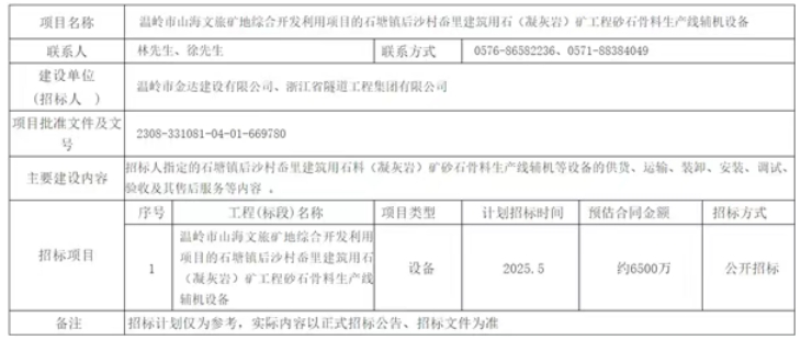 4月10日,浙江省臺州市溫嶺市人民政府發(fā)布溫嶺市山海文旅礦地綜合開發(fā)利用項(xiàng)目的石塘鎮(zhèn)后沙村岙里建筑用石(凝灰?guī)r)礦工程砂石骨料生產(chǎn)線輔機(jī)設(shè)備招標(biāo)計(jì)劃,計(jì)劃2025年5月招標(biāo)。預(yù)估合同金額約6500萬。 據(jù)了解,該項(xiàng)目位于溫嶺市石塘鎮(zhèn)后沙村岙里,估算投資近45億元,砂石儲量近1.2億噸,生產(chǎn)規(guī)模600萬噸/年,擬開采年限20年。產(chǎn)品種類包括但不限于山皮土、宕渣、普通碎石、普通機(jī)制砂、整形精品碎石、精品機(jī)制砂。 本次招標(biāo)內(nèi)容包括招標(biāo)人指定的砂石骨料生產(chǎn)線輔機(jī)等設(shè)備的供貨、運(yùn)輸、裝卸、安裝、調(diào)試、驗(yàn)收及其售后服務(wù)等內(nèi)容。