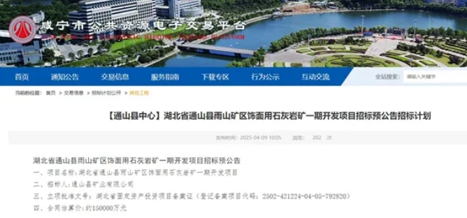 近日,湖北咸寧公共資源電子交易平臺發(fā)布湖北省通山縣雨山礦區(qū)飾面用石灰?guī)r礦一期開發(fā)項(xiàng)目招標(biāo)預(yù)公告,招標(biāo)人通山縣礦業(yè)有限公司,建設(shè)地點(diǎn)通山縣燕廈鄉(xiāng),計(jì)劃工期1095日歷天。 據(jù)公告顯示,該項(xiàng)目合同估算價(jià)約15億元,主要建設(shè)內(nèi)容包括礦石開采系統(tǒng)、礦石運(yùn)輸系統(tǒng)、尾礦綜合利用系統(tǒng)、礦石加工生產(chǎn)相關(guān)的公輔設(shè)施,包括供配電系統(tǒng)、給排水系統(tǒng)等、辦公及生活福利設(shè)施,含食堂浴室、綜合樓和職工宿舍等。 2024年12月底,通山縣礦業(yè)有限公司底價(jià)6.65億元競得該項(xiàng)目礦權(quán)。該項(xiàng)目資源總量約1.9億噸,年開采飾面用石灰?guī)r50萬方、建筑石料用石灰?guī)r約490萬噸,出讓年限29年。 據(jù)悉,通山縣礦業(yè)有限公司成立于2024年2月23日,所屬行業(yè)為開采專業(yè)及輔助性活動,經(jīng)營范圍包含非煤礦山礦產(chǎn)資源開采、金屬與非金屬礦產(chǎn)資源地質(zhì)勘探、建設(shè)工程監(jiān)理、非金屬礦及制品銷售、礦山機(jī)械銷售、礦業(yè)權(quán)評估服務(wù)、采礦行業(yè)高效節(jié)能技術(shù)研發(fā)等,是通山縣國有資本投資運(yùn)營有限公司全資子公司,屬國有企業(yè)。