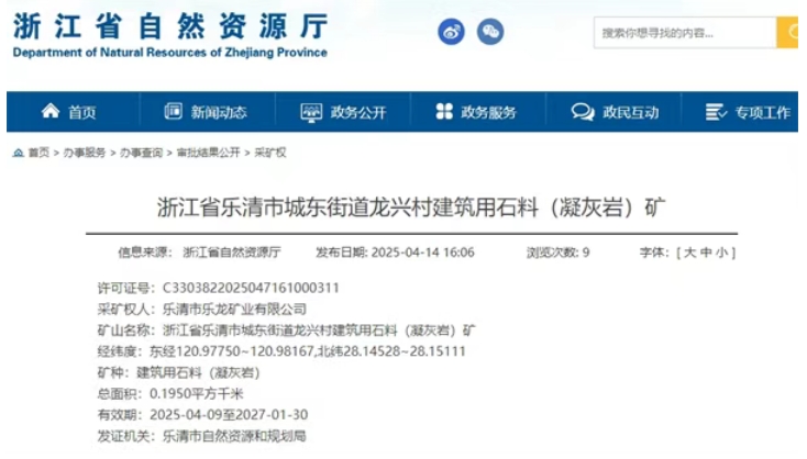 據(jù)浙江省自然資源廳消息,日前,浙江省樂(lè)清市城東街道龍興村建筑用石料(凝灰?guī)r)礦取得采礦許可證。 該礦出讓資源總量1208.42萬(wàn)噸,設(shè)計(jì)規(guī)模310萬(wàn)噸/年,出讓年限5年,起始價(jià)1.38億元,成交價(jià)2.18億元,政策處理費(fèi)用約1334.53萬(wàn)元,加之道路建設(shè)費(fèi)用及土地復(fù)墾基金共約4611.88萬(wàn)元,該礦資源成本約22.96元/噸。 2025年1月22日,樂(lè)清市樂(lè)龍礦業(yè)有限公司競(jìng)得該項(xiàng)目礦權(quán)。 據(jù)悉,樂(lè)清市樂(lè)龍礦業(yè)有限公司成立于2017年6月12日,所屬行業(yè)為其他采礦業(yè),經(jīng)營(yíng)范圍包含建筑用石料(凝灰?guī)r)露天開(kāi)采、石材加工/銷(xiāo)售、填方/填土工程服務(wù)等。
