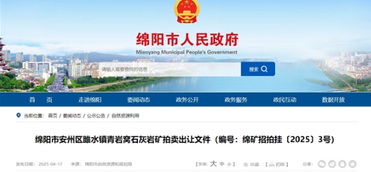 4月17日,四川省綿陽(yáng)市人民政府發(fā)布綿陽(yáng)市安州區(qū)雎水鎮(zhèn)青巖窩石灰?guī)r礦拍賣出讓公告,拍賣時(shí)間為2025年5月20日。該礦資源儲(chǔ)量超1億噸,生產(chǎn)規(guī)模350萬(wàn)噸/年,出讓年限28年,起始價(jià)1.8億元,原有礦權(quán)資產(chǎn)4940萬(wàn)元,資源成本超2.18元/噸。 該采礦權(quán)位于綿陽(yáng)市安州區(qū)雎水鎮(zhèn),開(kāi)采礦種為石灰?guī)r礦、白云巖礦,鼓勵(lì)進(jìn)行綜合利用。礦區(qū)資源量共計(jì)超1.05億噸,其中石灰?guī)r礦資源量8668.21萬(wàn)噸、白云巖礦資源量1852.97萬(wàn)噸。前期已有1宗采礦權(quán)對(duì)此處礦產(chǎn)資源進(jìn)行過(guò)開(kāi)發(fā)利用,現(xiàn)已注銷采礦許可證。 根據(jù)公告,采礦權(quán)人須按要求編報(bào)《綠色礦山建設(shè)方案》,按相關(guān)標(biāo)準(zhǔn)建設(shè)綠色礦山,并按程序申請(qǐng)?jiān)u估驗(yàn)收。礦山投產(chǎn)18個(gè)月內(nèi)須按程序建成綠色礦山并納入綠色礦山名錄庫(kù),未在規(guī)定時(shí)間成功納入的,礦山停止生產(chǎn)活動(dòng),至成功申報(bào)納入后方可恢復(fù)生產(chǎn)。采礦權(quán)人在開(kāi)采、運(yùn)輸、生產(chǎn)、經(jīng)營(yíng)過(guò)程中須嚴(yán)格遵守綿陽(yáng)市安州區(qū)礦產(chǎn)砂石資源開(kāi)發(fā)秩序綜合整治相關(guān)要求,嚴(yán)格落實(shí)安全生產(chǎn)、生態(tài)環(huán)境、稅收監(jiān)管等措施。 此外,礦山用地占用、青苗補(bǔ)償?shù)纫蛟O(shè)置和建設(shè)礦山產(chǎn)生的前期費(fèi)用皆由采礦權(quán)競(jìng)得人承擔(dān)。