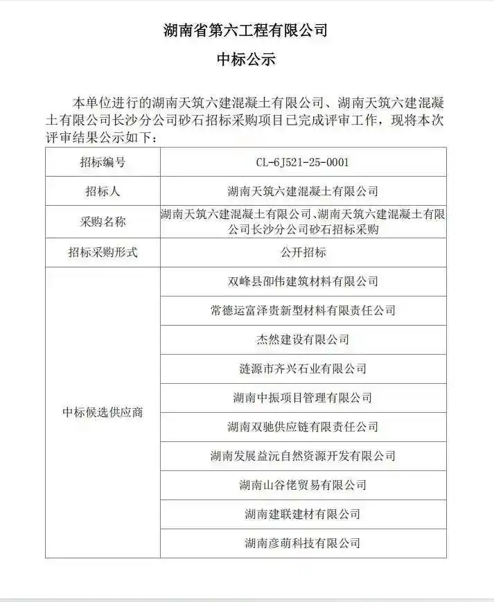 近日,湘潭城發(fā)·交運(yùn)物流在湖南天筑六建混凝土有限公司長沙分公司砂石材料招標(biāo)采購項(xiàng)目中成功中標(biāo),中標(biāo)總體金額約1200萬元。