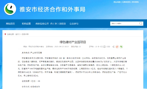 4月23日,雅安市經(jīng)濟(jì)合作和外事局發(fā)布蘆山縣雙石鎮(zhèn)綠色建材產(chǎn)業(yè)園項(xiàng)目招商情況,具體如下: 項(xiàng)目名稱(chēng):綠色建材產(chǎn)業(yè)園項(xiàng)目 具體地點(diǎn):蘆山縣雙石鎮(zhèn) 項(xiàng)目建設(shè)條件及主要內(nèi)容: 項(xiàng)目建設(shè)用地約500畝(具體以實(shí)測(cè)為準(zhǔn))工業(yè)用地,總投資約50億元,依托國(guó)需山綠色礦山資源,借助建設(shè)川藏鐵路、邛蘆滎高速的契機(jī),建設(shè)綠色建材產(chǎn)業(yè)園。 主要開(kāi)發(fā)建設(shè)包括儲(chǔ)量約3000萬(wàn)m³綠色礦山、大型環(huán)保精品骨料生產(chǎn)線、機(jī)制砂生產(chǎn)線、自動(dòng)化智能裝車(chē)倉(cāng)等。 項(xiàng)目基于市場(chǎng)需求、道路交通現(xiàn)狀等情況,擬分三期實(shí)施: 一期投資約10.5億元,擬建年產(chǎn)1000萬(wàn)噸建筑骨料生產(chǎn)線,最終達(dá)到年產(chǎn)3000萬(wàn)噸的規(guī)模。 二期投資約5.5億元,結(jié)合市場(chǎng)情況適時(shí)投入三期建設(shè)。 三期投資約34億元(含綜合開(kāi)發(fā),用于房建、軌道交通裝配式建筑)。 項(xiàng)目預(yù)計(jì)于2025年12月前啟動(dòng)。項(xiàng)目全面達(dá)產(chǎn)后,產(chǎn)值可達(dá)15億元,年上繳稅收2億元。 總投資額(億元):50 合作方式:合資或合作 項(xiàng)目聯(lián)系人及聯(lián)系電話:蘆山縣投促中心0835-6526333 所屬縣區(qū):蘆山縣