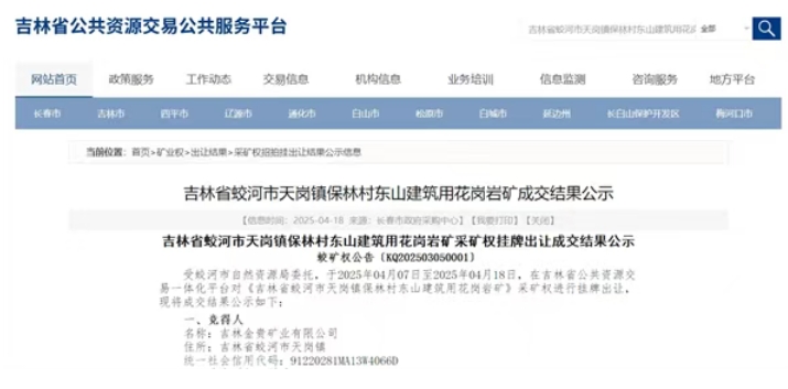 近日,從吉林省公共資源交易公共服務(wù)平臺獲悉,吉林省蛟河市天崗鎮(zhèn)保林村東山建筑用花崗巖礦成功出讓。該項目資源儲量超2億噸,年生產(chǎn)規(guī)模近600萬噸,出讓年限29.7年。吉林金貴礦業(yè)有限公司底價6880萬元競得,經(jīng)計算,該項目資源成本約0.33元/噸。 出讓公告顯示,吉林省蛟河市天崗鎮(zhèn)保林村東山建筑用花崗巖礦采礦權(quán)礦區(qū)面積0.7657平方公里,資源儲量7649.6萬方(約2.07億噸),競得人在競得采礦權(quán)后,嚴格按照礦產(chǎn)資源開發(fā)利用方案實施開采,擬設(shè)立采礦權(quán)擬選取生產(chǎn)規(guī)模為220萬方/年(約600萬噸/年),露天開采方式,礦山計算生產(chǎn)服務(wù)年限為29.7年。 另外,此次采礦權(quán)為基礎(chǔ)上擴大礦區(qū)范圍而出讓,競得人須支付原采礦權(quán)人(吉林金貴礦業(yè)有限公司)、原采礦權(quán)范圍內(nèi)剩余資源儲量、擬轉(zhuǎn)讓的房屋建筑物、設(shè)備設(shè)施等剩余資產(chǎn)價值經(jīng)專業(yè)機構(gòu)評估約4.09億元。因競得人為原采礦權(quán)人,無需支付該筆費用。 競得人吉林金貴礦業(yè)有限公司成立于2016年12月8日,所屬行業(yè)為非金屬礦采選業(yè),經(jīng)營范圍包含非煤礦山礦產(chǎn)資源開采、非金屬礦及制品銷售、建筑用石加工等,為民營企業(yè)。