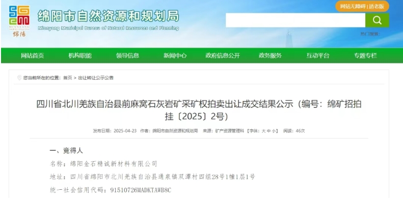 據(jù)四川綿陽(yáng)市自然資源和規(guī)劃局消息,四川省北川羌族自治縣前麻窩石灰?guī)r礦采礦權(quán)成功出讓。該礦資源儲(chǔ)量超1.1億噸,生產(chǎn)規(guī)模不低于500萬(wàn)噸/年,出讓年限21年,綿陽(yáng)金石精誠(chéng)新材料有限公司超2.97億元底價(jià)競(jìng)得。經(jīng)計(jì)算,該項(xiàng)目競(jìng)得成本約2.7元/噸。 據(jù)悉,該項(xiàng)目存在原采礦權(quán)人,但現(xiàn)有公開信息未明確提及原采礦權(quán)人的具體名稱,暫未可知該項(xiàng)目原采礦權(quán)人是否為競(jìng)得人綿陽(yáng)金石精誠(chéng)新材料有限公司,假如不是,那么競(jìng)得人還須支付原采礦權(quán)人資產(chǎn)費(fèi)用及剩余資源量?jī)r(jià)值超1億元。加之該費(fèi)用,該項(xiàng)目競(jìng)得成本則約3.62元/噸。 據(jù)統(tǒng)計(jì),截止目前,四川已成功出讓18宗砂石類采礦權(quán)(包含此次砂石礦),合計(jì)資源儲(chǔ)量7.6億噸,設(shè)計(jì)生產(chǎn)規(guī)模約3900萬(wàn)噸/年,出讓價(jià)值16.31億元,平均成本2.44元/噸。 除此之外,四川還有一宗資源儲(chǔ)量超1億噸,生產(chǎn)規(guī)模350萬(wàn)噸/年石灰?guī)r礦正在掛牌出讓中,拍賣時(shí)間為2025年5月20日。 500萬(wàn)噸/年砂石采礦權(quán)成功出讓 四川省北川羌族自治縣前麻窩石灰?guī)r礦開采礦種石灰?guī)r、建筑石料用灰?guī)r、建筑用白云巖,開采境界內(nèi)有石灰?guī)r資源量3683.94萬(wàn)噸,建筑石料用灰?guī)r資源量2253.10萬(wàn)噸,建筑用白云巖資源量5070.26萬(wàn)噸,合計(jì)資源量1.1億噸,生產(chǎn)規(guī)模不低于500萬(wàn)噸/年,出讓年限21年,綿陽(yáng)金石精誠(chéng)新材料有限公司超2.97億元底價(jià)競(jìng)得。 競(jìng)得人還須支付原采礦權(quán)人建構(gòu)筑物、機(jī)器設(shè)備等所涉及的實(shí)物資產(chǎn)和無(wú)形資產(chǎn)7589.29萬(wàn)元以及原采礦權(quán)剩余資源量859.89萬(wàn)噸,按第三方評(píng)估機(jī)構(gòu)對(duì)采礦權(quán)出讓收益評(píng)估價(jià)值2.93元/噸*剩余資源量礦石計(jì)算價(jià)值約2519.48萬(wàn)元,由競(jìng)得人直接向原礦權(quán)人承擔(dān)支付,相關(guān)風(fēng)險(xiǎn)自行承擔(dān)。 據(jù)悉,綿陽(yáng)金石精誠(chéng)新材料有限公司成立于2024年5月6日,所屬行業(yè)為科技推廣和應(yīng)用服務(wù)業(yè),經(jīng)營(yíng)范圍包含新材料技術(shù)推廣服務(wù)、技術(shù)服務(wù)、非金屬礦及制品銷售、非金屬礦物制品制造、建筑用石加工、建筑材料銷售等等。