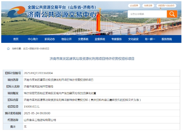 近日,濟(jì)南市萊蕪區(qū)建筑垃圾資源化利用項(xiàng)目特許經(jīng)營(yíng)權(quán)招標(biāo)項(xiàng)目發(fā)布公告,項(xiàng)目估算投資為15000萬(wàn)元,預(yù)計(jì)將于5月24日發(fā)布。