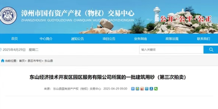 近日,福建漳州東山縣國有資產產權交易中心發(fā)布東山經濟技術開發(fā)區(qū)園區(qū)服務有限公司所屬的一批建筑用砂拍賣公告。該項目總量約27萬噸,起拍單價36.8元/噸(含稅價),為第3次拍賣。相比第1次拍賣價格下降12.75元/噸。 據(jù)悉,該項目第1次、2次起拍單價(含稅價)分別為49.55元/噸、45.59元/噸,均流拍。 拍賣公告顯示,該標的物為建筑用砂(換填砂),存放時間較長(自然堆放數(shù)年),混有生物外殼及碎屑,部分換填砂表面長有野草,未經過二次加工。標的以現(xiàn)狀進行拍賣和移交,拍賣時間2025年5月9日,看樣時間2025年5月6日-7日。 該標的存放于兩個地點,分別為漳州市東山縣疏港公路北側、漳州信耀玻璃有限公司南側以及慧民電池隔板有限公司北側、福建安東實業(yè)有限公司南側。