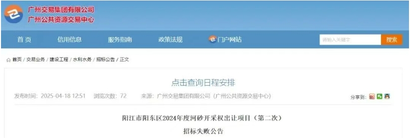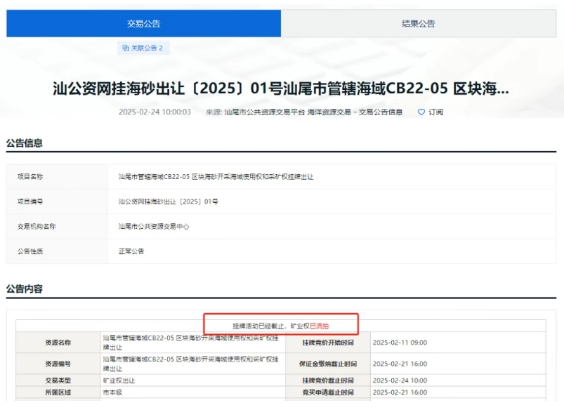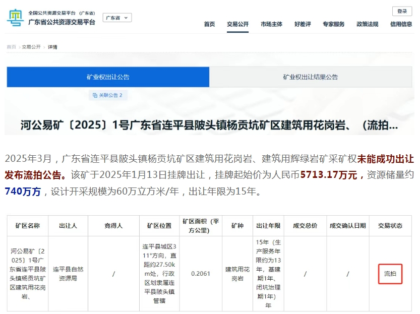 近年來,隨著砂石行業(yè)進入深度調(diào)整時期,即使是曾經(jīng)最為火爆的廣東砂石市場也出現(xiàn)低迷現(xiàn)象,就在2025年的前4個月中就有4宗礦權(quán)出現(xiàn)流拍、招標失敗、中止出讓,總出讓起始價超13億元。 當前,房地產(chǎn)和基建投資增速下降,砂石行業(yè)有效需求不足,行業(yè)面臨產(chǎn)能過剩,砂石礦山企業(yè)應(yīng)更加注重生產(chǎn)線建設(shè)的合理性與成本、石礦運營費用的高低、銷售區(qū)域產(chǎn)能和市場需求量的大小、運輸條件的好壞和運輸費用的高低、礦山投資的資金成本、對石礦運營的熟悉程度等因素,積極應(yīng)對行業(yè)挑戰(zhàn)! 2025年2月 2025年2月,汕尾市管轄海域CB22-05區(qū)塊海砂開采海域使用權(quán)和采礦權(quán)流拍,據(jù)了解,此次為這宗海砂項目的第六次掛牌。首次終止、二次流拍,三次終止,四次流拍,五次終止,起始價“一降再降”。第六次出讓最終還是未能成功出讓。 據(jù)了解,CB22-05海砂開采海域使用權(quán)和采礦權(quán)位于廣東省汕尾市陸豐市田尾角東南側(cè)管轄海域CB22-05區(qū)塊,海域面積2.12平方千米,海砂資源儲量2581.92萬立方米,可采資源量2097.26萬立方米。 本次海域使用權(quán)和采礦權(quán)出讓年限為3年,起始價為人民幣62917.8萬元(其中:海域使用權(quán)起始價25305.54 萬元,海砂采礦權(quán)起始價37612.26 萬元)。 2025年3月 2025年3月,廣東省連平縣陂頭鎮(zhèn)楊貢坑礦區(qū)建筑用花崗巖、建筑用輝綠巖礦采礦權(quán)未能成功出讓發(fā)布流拍公告。該礦于2025年1月13日掛牌出讓,掛牌起始價為人民幣5713.17萬元,資源儲量約740萬方,設(shè)計開采規(guī)模為60萬立方米/年,出讓年限為15年。 該礦位于連平縣城區(qū)311°方向,直距約27.50km處,行政區(qū)劃隸屬連平縣陂頭鎮(zhèn)管轄。礦區(qū)范圍內(nèi)建筑用花崗巖保有控制的資源量619.22萬立方米,推斷的資源量483.57萬立方米;建筑用輝綠巖保有控制的資源量礦石量120.31萬立方米,保有推斷的資源量礦石量32.51萬立方米。 2025年4月 2025年4月,廣東陽江市陽東區(qū)2024年度河砂開采權(quán)出讓項目(第二次)因沒有投標單位辦理投標登記,根據(jù)招標文件及相關(guān)法律法規(guī)的規(guī)定,招標失敗。 本次招標包含三個可采區(qū),采區(qū)一控制開采總量為24.1萬方;采區(qū)二控制開采總量為4.77萬方;采區(qū)三控制開采總量為1.73萬方??傞_采量30.6萬方。最高投標限價2754萬元。單價約90元/噸。 2025年4月1日,云浮市自然資源局發(fā)布廣東省云浮市云城區(qū)坳頭大窩坑區(qū)水泥用石灰?guī)r、溶劑用白云巖采礦權(quán)中止公告。 該礦確定的水泥用石灰?guī)r、熔劑用白云巖和水泥用配料類礦石可采儲量為28484.79萬噸,其中水泥用石灰?guī)r礦17411.32萬噸,熔劑用白云巖礦8428.90萬噸,水泥配料類原料礦石量1461.09萬立方米(2644.57萬噸)。起始價65000萬元,出讓年限30年。