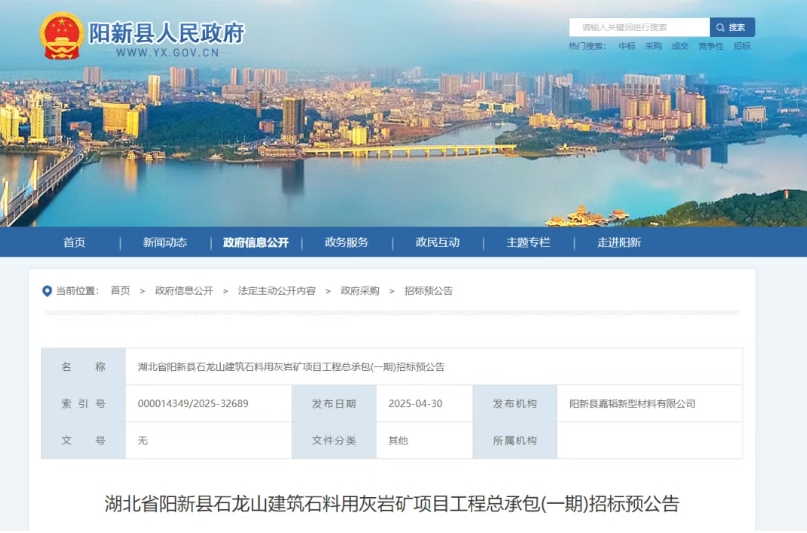 據(jù)悉,湖北省陽新縣石龍山建筑石料用灰?guī)r礦項(xiàng)目工程總承包(一期)公開招標(biāo),招標(biāo)人為陽新縣嘉韜新型材料有限公司,項(xiàng)目總投資2.8億元。