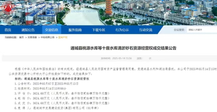 近日,湖北咸寧通城縣公共資源交易中心發(fā)布一批儲量971.18萬方石料、約2737.58萬噸河砂、約762.6萬噸水庫清淤砂石資源的經(jīng)營權(quán)成交結(jié)果公告,均為當?shù)貒蟮變r競得,單價1.32-5.25元/噸不等。