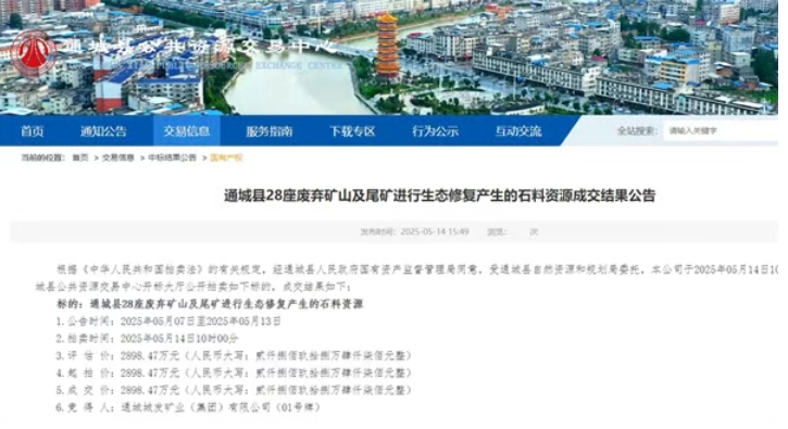 通城縣28座廢棄礦山及尾礦進行生態(tài)修復產(chǎn)生的石料資源,共計約為971.18萬方,運營期15年(含建設期2年),起拍價2898.47萬元。通城城發(fā)礦業(yè)(集團)有限公司底價競得。經(jīng)計算,該項目競得成本約2.98元/方。競得企業(yè)成立于2019年3月29日,所屬行業(yè)為非金屬礦采選業(yè),經(jīng)營范圍包含礦業(yè)項目投資/開發(fā)/經(jīng)營管理、礦產(chǎn)資源(含砂石、長石礦、花崗巖、高嶺土等)收儲、開采、加工、儲存、運輸、礦產(chǎn)品的銷售、礦業(yè)技術(shù)咨詢、技術(shù)服務、礦產(chǎn)品技術(shù)開發(fā),基礎設施建設施工,水利工程建設施工等,屬國有企業(yè)。