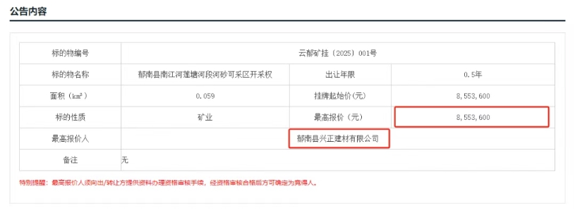 此次掛牌為該項目第二次出讓,該項目首次掛牌為2024年9月5日,掛牌起始為950.4萬元(每立方米河砂80元),但于2024年10月14日流拍,本次出讓降價95.04萬元,終于成功出讓!