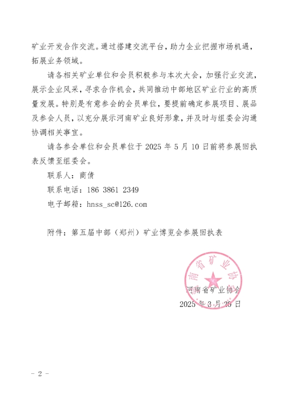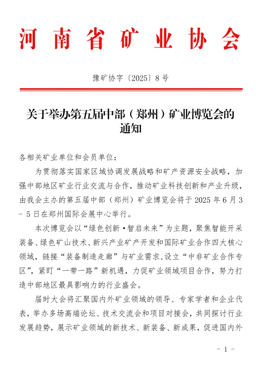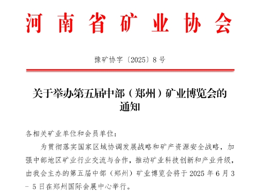 為深入貫徹落實(shí)國家關(guān)于礦業(yè)高質(zhì)量發(fā)展的戰(zhàn)略部署,加強(qiáng)中部地區(qū)礦業(yè)行業(yè)交流與合作,推動礦業(yè)科技創(chuàng)新和產(chǎn)業(yè)升級,由河南省礦業(yè)協(xié)會、河南省豫地科技集團(tuán)有限公司聯(lián)合主辦的2025第五屆中部(鄭州)礦業(yè)博覽會將于2025年6月3日-5日在鄭州國際會展中心隆重舉辦,現(xiàn)誠邀礦業(yè)領(lǐng)域領(lǐng)導(dǎo)嘉賓蒞臨參觀,共享行業(yè)前沿成果,共謀產(chǎn)業(yè)創(chuàng)新之路!