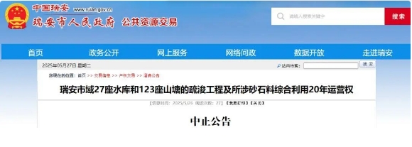 近日,浙江溫州中正拍賣有限公司發(fā)布公告,中止原定于5月30日進行拍賣27座水庫和123座山塘的疏浚工程及所涉砂石料綜合利用20年運營權(quán)出讓活動。