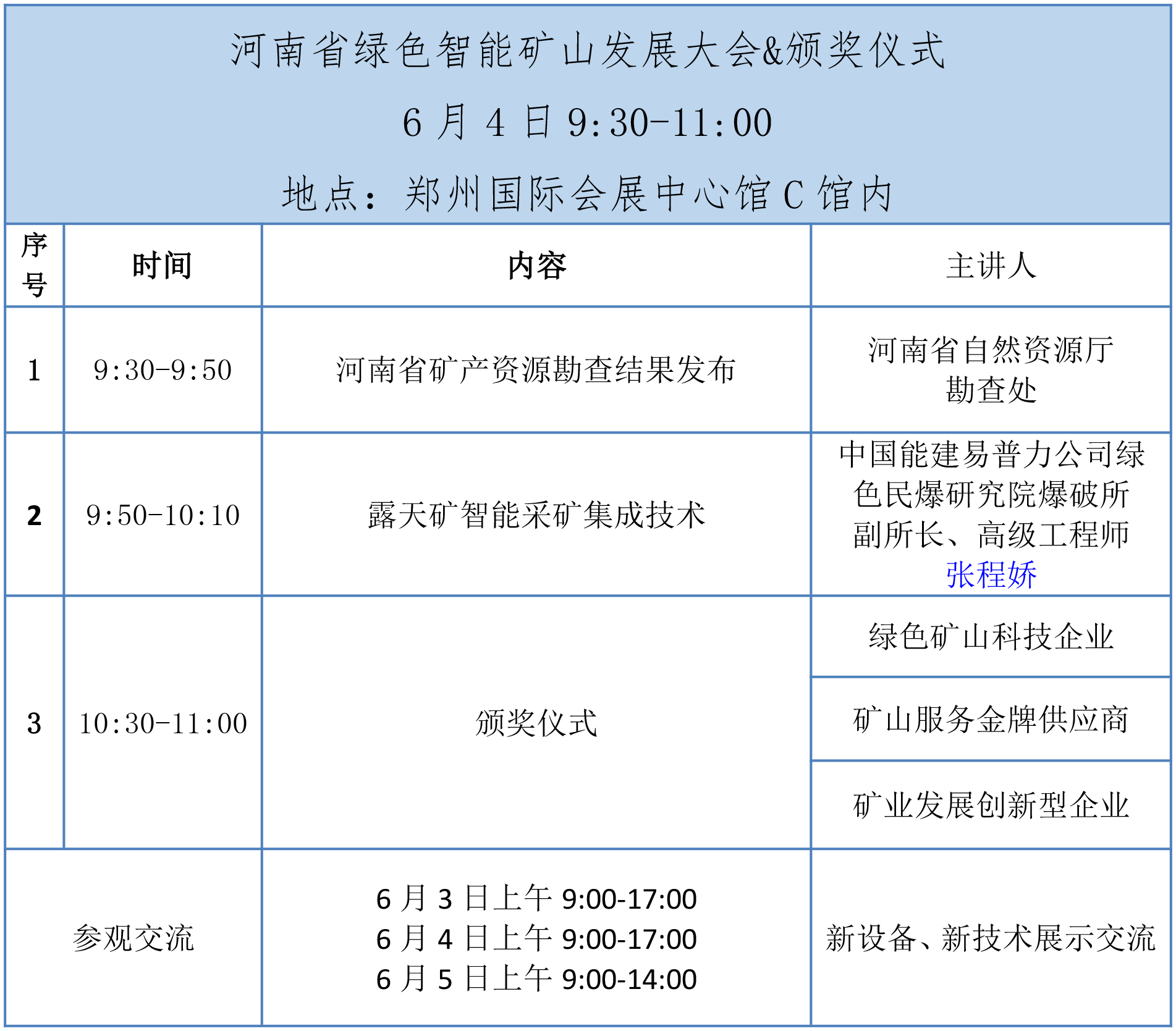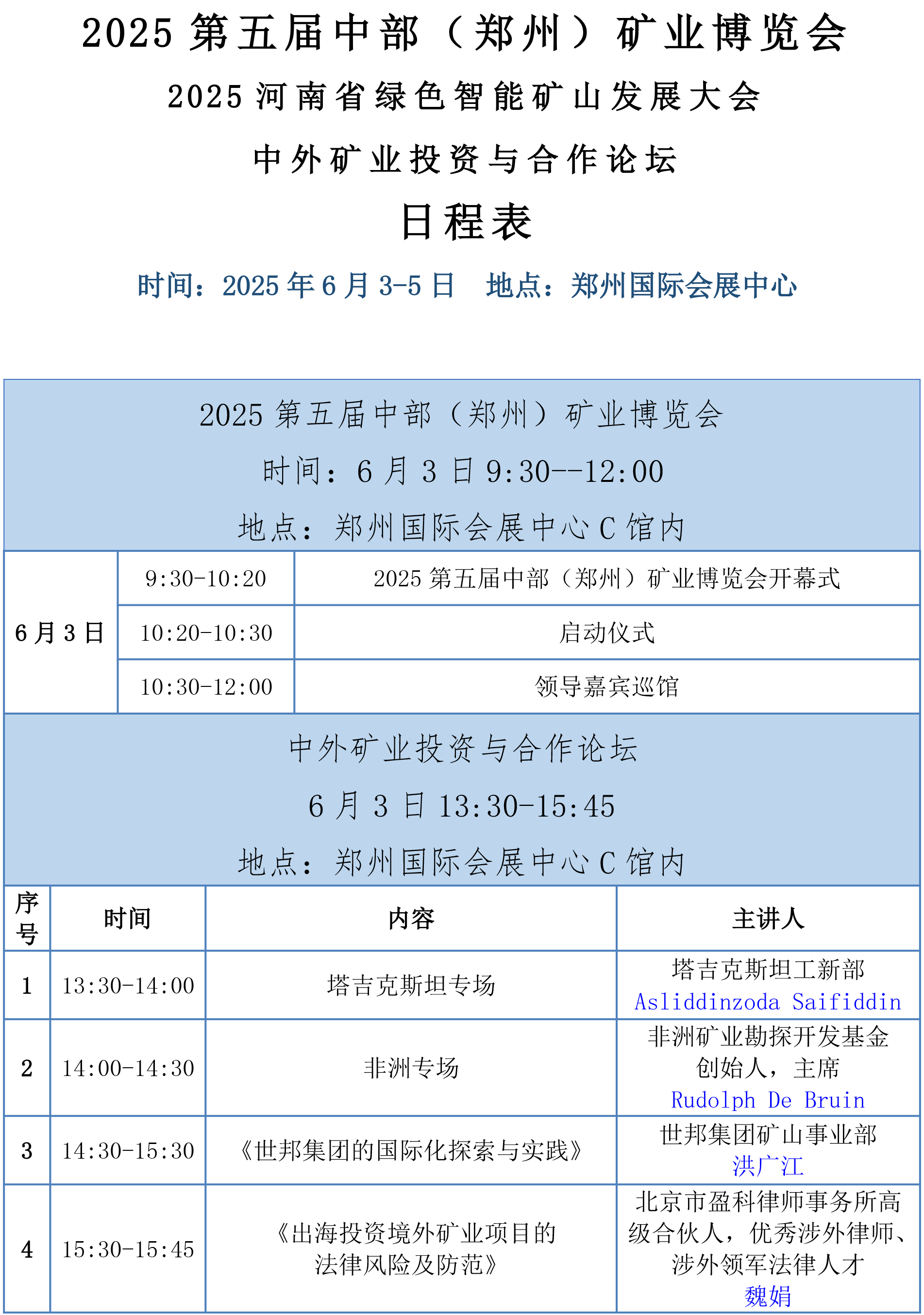 由河南省自然資源廳、中國砂石協(xié)會、中國礦業(yè)報社指導;河南省礦業(yè)協(xié)會、環(huán)球破碎機網(wǎng)聯(lián)合主辦的“2025第五屆中部(鄭州)礦業(yè)博覽會”、將于2025年6月3日-5日在河南鄭州舉辦,同期舉辦“中外礦業(yè)投資與合作論壇”、“2025河南省綠色智能礦山發(fā)展大會”、“頒獎儀式”等活動。 本次博覽會,以“綠色創(chuàng)新·智啟未來”為主題,打造中部地區(qū)最具影響力的礦業(yè)行業(yè)盛會,聚焦智能開采裝備、綠色礦山技術(shù)、新能源礦產(chǎn)開發(fā)及國際礦權(quán)合作四大核心領(lǐng)域,鏈接“裝備制造走廊”與礦業(yè)需求,設(shè)立“中外礦業(yè)合作專區(qū)”,緊抓“一帶一路”新機遇,力促礦產(chǎn)國項目推介與跨境合作洽談。屆時大會將匯聚國內(nèi)外礦業(yè)領(lǐng)域的專家學者、企業(yè)代表,共同探討行業(yè)發(fā)展趨勢,展示礦業(yè)領(lǐng)域的新技術(shù)、新裝備、新成果。 展會期間,邀請塔吉克斯坦工新部、非洲礦業(yè)勘探開發(fā)基金等海外礦業(yè)部門及機構(gòu),共同舉辦中外礦業(yè)投資與合作論壇;邀請河南省自然資源廳相關(guān)負責人做河南省礦產(chǎn)資源勘查結(jié)果發(fā)布,另邀請行業(yè)專家作綠色智能礦山發(fā)展相關(guān)學術(shù)報告,為展商和參會企業(yè)提供更多技術(shù)交流和項目對接合作機會。 01展會時間、地點 時間:2025年6月3-5日 地點:鄭州國際會展中心C館 地址:鄭州市鄭東新區(qū)商務(wù)內(nèi)環(huán)路中央公園1號 02、組織機構(gòu) 指導單位:河南省自然資源廳 中國砂石協(xié)會 中國礦業(yè)報社 主辦單位:河南省礦業(yè)協(xié)會 環(huán)球破碎機網(wǎng) 承辦單位:河南英富曼會展服務(wù)有限公司 這場盛會即將于6月3日在鄭州國際會展中心拉開帷幕!以下是本次大會日程,請大家先睹為快! 展會預(yù)登記通道已全面開啟 觀眾提前預(yù)登記可享受三大福利 為了使觀眾更便捷的參觀展會, 掃描上方二維碼即可完成登記! 溫馨提示:記得保留截圖哦
