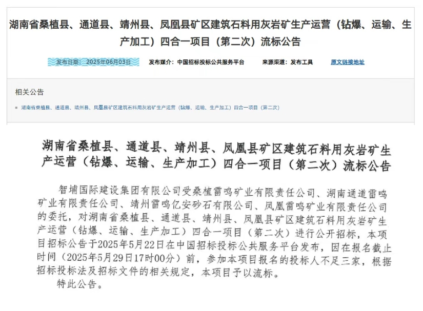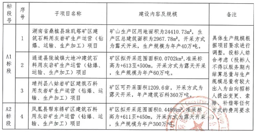 近日,湖南省桑植縣、通道縣、靖州縣、鳳凰縣礦區(qū)建筑石料用灰?guī)r礦生產(chǎn)運營(鉆爆、運輸、生產(chǎn)加工)四合一項目(第二次)因投標人不足三家流標。項目生產(chǎn)總規(guī)模為年產(chǎn)760萬噸,資金來源為自籌資金42718萬元。 據(jù)了解,該項目第一次招標也因投標人不足流標。 湖南省桑植縣、通道縣、靖州縣、鳳凰縣礦區(qū)建筑石料用灰?guī)r礦生產(chǎn)運營(鉆爆、運輸、生產(chǎn)加工)四合一項目己由項目審批/核準/備案機關批準,項目資金來源為自籌資金42718萬元,招標人為桑植雷鳴礦業(yè)有限責任公司、湖南通道雷鳴礦業(yè)有限責任公司、靖州雷鳴億安砂石有限公司、鳳凰雷鳴礦業(yè)有限責任公司。生產(chǎn)總規(guī)模為年產(chǎn)760萬噸。 據(jù)此前招標公告顯示,本項目包含四個子項目,分別是: 1、湖南省桑縣珠璣塔礦區(qū)建筑石料用灰?guī)r礦(鉆爆、運輸、生產(chǎn)加工)項目,項目業(yè)主為桑植雷鳴礦業(yè)有限責任公司,年產(chǎn)40萬噸。 2、通道縣隴城鎮(zhèn)大地沖建筑石料用灰?guī)r礦(鉆爆、運輸、生產(chǎn)加工)項目,項目業(yè)主為湖南通道雷鳴礦業(yè)有限責任公司,年產(chǎn)60萬噸。 3、靖州縣八姑巖礦區(qū)建筑石料用灰?guī)r礦(鉆爆、運輸、生產(chǎn)加工)項目,項目業(yè)主為靖州雷鳴億安砂石有限公司,年產(chǎn)360萬噸。 4、鳳凰縣幫東繡礦區(qū)建筑石料用灰?guī)r礦(鉆爆、運輸、生產(chǎn)加工)項目,項目業(yè)主為鳳凰雷鳴礦業(yè)有限責任公司,年產(chǎn)300萬噸。