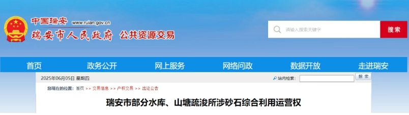 近日,浙江省溫州市瑞安市公共資源交易中心發(fā)布瑞安市部分水庫、山塘疏浚所涉砂石綜合利用運營權(quán)轉(zhuǎn)讓公告,疏浚工程所涉砂石料資源約3650萬方,起始價61599.41萬元,單價約為16.8元/方。 據(jù)悉,標的為瑞安市域27座水庫和123座山塘的疏浚工程及所涉砂石料綜合利用20年運營權(quán)(含1年建設(shè)期)運營期內(nèi)可根據(jù)實際情況進行輪動疏浚作業(yè)采集砂石料。 拍賣時間:2025年6月9日10時。 據(jù)了解,運營期內(nèi),完全由競得人自行投入設(shè)備及成本按要求實施上述水庫山塘的疏浚工程施工并負責疏浚工程所涉的垃圾清運消納工作,由競得人完全承擔上述水庫山塘疏浚工程施工及關(guān)聯(lián)作業(yè)的一切安全責任。疏浚后取得砂石料資源的收益權(quán)歸乙方所有,瑞安市水利局不承擔上述疏浚工程所涉砂石料資源【石料約301萬立方米(約602萬噸)、砂料約1204.28萬立方米(約2408.56萬噸)、淤泥約376.33萬立方米(約639.78萬噸)】的數(shù)量、品質(zhì)、規(guī)格及其他瑕疵擔保責任。 運營期內(nèi),瑞安市水利局負責對山塘、水庫的工程安全和運行進行監(jiān)督管理,競得人實施上述水庫山塘的疏浚工程施工并負責疏浚工程的安全及所涉的垃圾清運消納工作,競得人應(yīng)委派專業(yè)人員實施疏浚工程施工,以保障項目的正常運作。