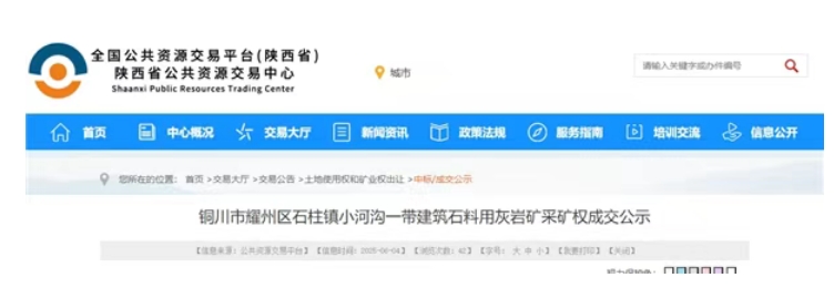 6月4日,陜西省銅川市耀州區(qū)石柱鎮(zhèn)小河溝一帶建筑石料用灰?guī)r礦采礦權(quán)被銅川福順建材有限公司成功競得。該礦可采儲量1730.84萬噸,出讓年限5.77年,生產(chǎn)規(guī)模約300萬噸/年,成交價(jià)2268萬元,資源價(jià)款1.31元/噸。 該采礦權(quán)位于銅川市耀州區(qū)石柱鎮(zhèn),出讓面積0.2198平方千米,競得人需一次性付清采礦權(quán)出讓收益金。競得人須按要求編制《礦山地質(zhì)環(huán)境保護(hù)與土地復(fù)墾方案》,開采過程中,按有關(guān)規(guī)定計(jì)提礦山地質(zhì)環(huán)境治理恢復(fù)與土地復(fù)墾基金,履行礦山地質(zhì)環(huán)境保護(hù)及土地復(fù)墾義務(wù),做好礦山地質(zhì)環(huán)境保護(hù)與土地復(fù)墾等相關(guān)工作。 本次出讓的采礦權(quán)僅為該區(qū)塊的采礦權(quán),不包括為礦產(chǎn)資源開采而需要占用的土地使用權(quán)和地上附著物以及構(gòu)筑物的物權(quán)權(quán)利,競得人在礦山建設(shè)和礦產(chǎn)資源開采過程中涉及的土地、林業(yè)、水利、環(huán)保、應(yīng)急、電力、道路及開采競得的礦山所需辦理的其他相關(guān)手續(xù),由競得人按有關(guān)規(guī)定到相關(guān)部門辦理,產(chǎn)生的費(fèi)用由競得人負(fù)責(zé)。 據(jù)悉,銅川福順建材有限公司成立于2020年1月15日,位于陜西省銅川市耀州區(qū)石柱鎮(zhèn)南頭村呂家咀一組一號,是一家以非金屬礦采選為主營業(yè)務(wù)的小微企業(yè),注冊資本880萬元。作為天玉方圓集團(tuán)旗下企業(yè),2024年與福建省天玉方圓礦業(yè)有限公司簽訂年產(chǎn)500萬噸砂石骨料生產(chǎn)線建設(shè)項(xiàng)目合同,并聯(lián)合開展礦山管理人才培訓(xùn)。