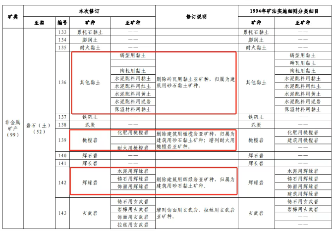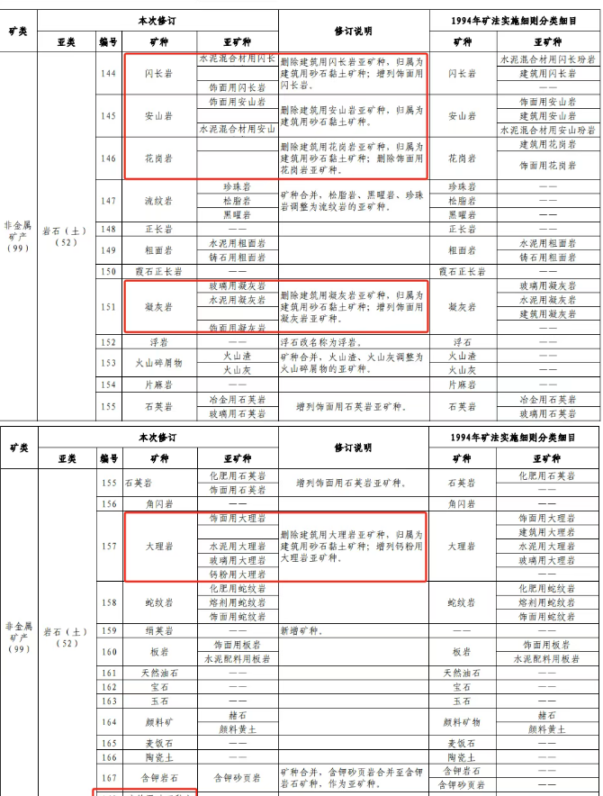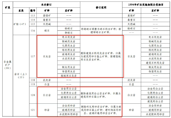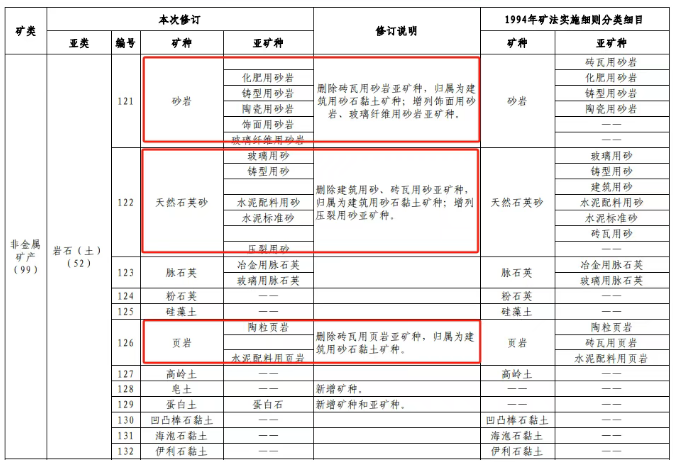 近日,為貫徹落實新修訂的《礦產(chǎn)資源法》,做好礦產(chǎn)資源管理工作,細(xì)化礦產(chǎn)資源目錄,自然資源部發(fā)布公開征求《礦產(chǎn)資源亞礦種目錄(征求意見稿)》意見的公告(以下簡稱《意見稿》)。 據(jù)了解,《意見稿》有關(guān)說明表示,刪除14個建筑用砂石黏土相關(guān)亞礦種。 此次新增了建筑用砂石黏土礦種,其涵蓋范圍包括但不限于建筑用砂、磚瓦用砂、海砂、建筑石料用灰?guī)r、建筑用白云巖、建筑用橄欖巖、建筑用輝綠巖、建筑用安山巖、建 筑用閃長巖、建筑用花崗巖、建筑用凝灰?guī)r、建筑用大理巖、 磚瓦用砂巖、磚瓦用頁巖和磚瓦用黏土。本次刪除上述除海砂外的其他14個亞礦種。 據(jù)悉,調(diào)整后的礦種、亞礦種總體情況1994年礦法實施細(xì)則中礦產(chǎn)資源分類細(xì)目和之后國務(wù)院批準(zhǔn)新發(fā)現(xiàn)的6個礦種,我國共有174個礦種和84個亞礦種。本次修訂后礦種數(shù)仍為174個,亞礦種98個。均可 與原礦種及亞礦種對應(yīng)。 新舊礦產(chǎn)資源目錄對照表(涉砂石)