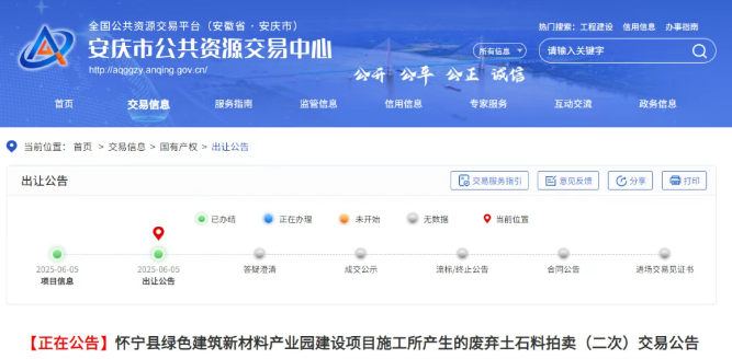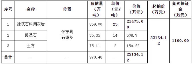 據(jù)悉,安徽安慶市公共資源交易中心發(fā)布懷寧縣綠色建筑新材料產(chǎn)業(yè)園建設(shè)項(xiàng)目施工所產(chǎn)生的廢棄土石料拍賣(二次)公告,本次拍賣的廢棄土石料共計(jì)超970萬噸,22134.12萬元起拍。 其中,建筑石料用灰?guī)r預(yù)估量859萬噸、單價(jià)25元/噸、價(jià)值21475萬元;路基石預(yù)估量36.35萬噸、單價(jià)14元/噸、價(jià)值508.9萬元;土方預(yù)估量75.11萬噸、單價(jià)2元/噸、價(jià)值150.22萬元。 拍賣標(biāo)的基本情況(以現(xiàn)狀拍賣) (一)本次拍賣標(biāo)的為懷寧縣綠色建筑新材料產(chǎn)業(yè)園建設(shè)項(xiàng)目施工所產(chǎn)生的廢棄土石料,廢棄土石料數(shù)量、類別、性質(zhì)等以實(shí)際現(xiàn)狀為準(zhǔn)。 (二)本次拍賣的廢棄土石料的買受人須自行承擔(dān)標(biāo)的物廢棄土石料的開挖施工及裝車運(yùn)輸,廢棄土石料的開挖施工單位必須具備相關(guān)施工開采資質(zhì)、具備安全生產(chǎn)許可證。