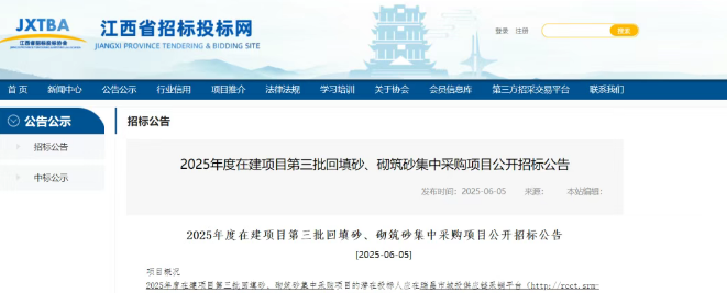 近日,瑞昌市瑞建置業(yè)有限公司、中水瑞建工程有限公司、江西中力達(dá)地網(wǎng)技術(shù)有限公司發(fā)布2025年度在建項(xiàng)目第三批回填砂、砌筑砂集中采購(gòu)項(xiàng)目公開招標(biāo)公告。 根據(jù)公告內(nèi)容,采購(gòu)回填砂(中、粗機(jī)制砂)191000噸,最高限價(jià)13370000元,砌筑砂(中粗砂)9630噸,最高限價(jià)1059300元。預(yù)算金額總計(jì)14429300元。本項(xiàng)目接受聯(lián)合體。 2025年度在建項(xiàng)目第三批回填砂、砌筑砂集中采購(gòu)項(xiàng)目公開招標(biāo)公告 項(xiàng)目基本情況 項(xiàng)目編號(hào):瑞國(guó)控建招字【2025】第134號(hào) 項(xiàng)目名稱:2025年度在建項(xiàng)目第三批回填砂、砌筑砂集中采購(gòu) 采購(gòu)方式:公開招標(biāo) 預(yù)算金額:14429300元人民幣 最高限價(jià):14429300元人民幣 采購(gòu)需求: 合同履行期限:2025 年 6 月 19日至 2026 年 5 月 15 日(具體以開工報(bào)告要求為準(zhǔn))。 本項(xiàng)目接受聯(lián)合體。 獲取招標(biāo)文件 時(shí)間:2025年06月05日至2025年06月12日 地點(diǎn):瑞昌市城投供應(yīng)鏈采銷平臺(tái)(http://rcct.srm-a.gyuncai.com/)-庫(kù)外招標(biāo) 方式:自行下載 提交投標(biāo)文件截止時(shí)間、開標(biāo)時(shí)間和地點(diǎn) 截止時(shí)間:2025年06月17日14點(diǎn)30分(北京時(shí)間) 地點(diǎn):瑞昌市東環(huán)路與赤烏東路交叉口科技園˙示范園研發(fā)樓中國(guó)地網(wǎng)8樓建工集團(tuán)會(huì)議室 公告期限 自本公告發(fā)布之日起5個(gè)工作日。 對(duì)本次招標(biāo)提出詢問,請(qǐng)按以下方式聯(lián)系。 1.采購(gòu)人信息 名 稱:瑞昌市瑞建置業(yè)有限公司、中水瑞建工程有限公司、江西中力達(dá)地網(wǎng)技術(shù)有限公司 地 址:瑞昌市東環(huán)路7號(hào)科技園˙示范園研發(fā)樓7樓 聯(lián)系方式: 王賢林 15267360383;李松霖 15350240810 2.采購(gòu)代理機(jī)構(gòu)信息 名 稱:江西省壹凡工程咨詢有限公司 地 址:瑞昌市楊林大道南側(cè)林湖苑9棟2單元102室 電子函件:jxs_yfec@163.com 3.項(xiàng)目聯(lián)系方式 項(xiàng)目聯(lián)系人:趙女士 電 話:0792-4221819 18770230800 4.監(jiān)督單位 名 稱:瑞昌市國(guó)有投資控股集團(tuán)有限公司經(jīng)營(yíng)管理部 電 話:0792-3602656