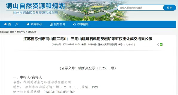 近日,江蘇省徐州市自然資源網(wǎng)上交易系統(tǒng)發(fā)布銅山區(qū)二毛山-三毛山建筑石料用灰?guī)r礦掛牌出讓結(jié)果。當(dāng)?shù)貒笮熘萃瓷鷳B(tài)環(huán)境治理有限公司底價5.6億元競得。該礦資源儲備量9297.79萬噸,出讓年限16年。根據(jù)公告,該礦未公布具體生產(chǎn)規(guī)模,經(jīng)測算,年產(chǎn)能約600萬噸,競得單價6.02元/噸。