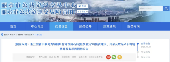 6月20日,浙江省麗水市公共資源交易中心發(fā)布青田縣高湖鎮(zhèn)桐川村建筑用石料(凝灰?guī)r)礦山投資建設(shè)、開采及成品砂石料銷售等服務(wù)項(xiàng)目招標(biāo)公告。接受聯(lián)合體投標(biāo),開標(biāo)時(shí)間為2025年7月11日。 采購預(yù)算方面,勞務(wù)報(bào)酬(建設(shè)、開采及加工、復(fù)墾、銷售等)固定綜合單價(jià)最高限價(jià)24.5元/噸(含稅);成品砂石料銷售保底綜合單價(jià)最低限價(jià)38元/噸(場地價(jià),不含增值稅,稅率按稅法規(guī)定執(zhí)行)。 根據(jù)公告,礦區(qū)范圍內(nèi)出讓資源量約6186.6萬噸,其中建筑用石料(凝灰?guī)r)控制資源量5684.35萬噸,宕碴(強(qiáng)風(fēng)化層)502.25萬噸,殘坡積層表土剝離量84.75萬立方米。設(shè)計(jì)生產(chǎn)規(guī)模700萬噸/年,服務(wù)期限自采礦許可證頒發(fā)之日起9年6個(gè)月,其中建設(shè)期為21個(gè)月。2023年12月22日,當(dāng)?shù)貒笄嗵锟h砂石料有限公司以3.52億元成功競得該采礦權(quán)。