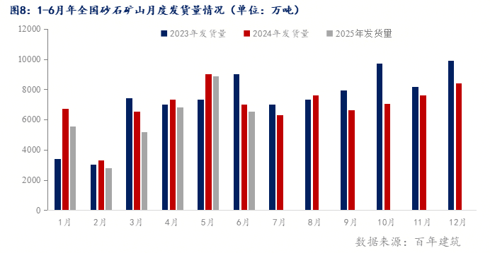 截至2025年6月30日,據(jù)百年建筑網(wǎng)調(diào)研1-6月份砂石礦山累計發(fā)貨量約35780.97萬噸,累計同比下降10.4%。一季度春節(jié)前后市場開工暫緩,需求一般,砂石發(fā)貨貨量偏低;二季度市場需求略有回升,但5-6月雨水天氣頻繁,抑制市場需求回升,新投礦山持續(xù)釋放,在地產(chǎn)市場需求急劇收窄背景下,砂石普料供大于求現(xiàn)狀難改。砂石物流運輸?shù)荣Q(mào)易環(huán)節(jié)利潤持續(xù)縮小,目前砂石行業(yè)遭遇多年以來的最低迷階段。